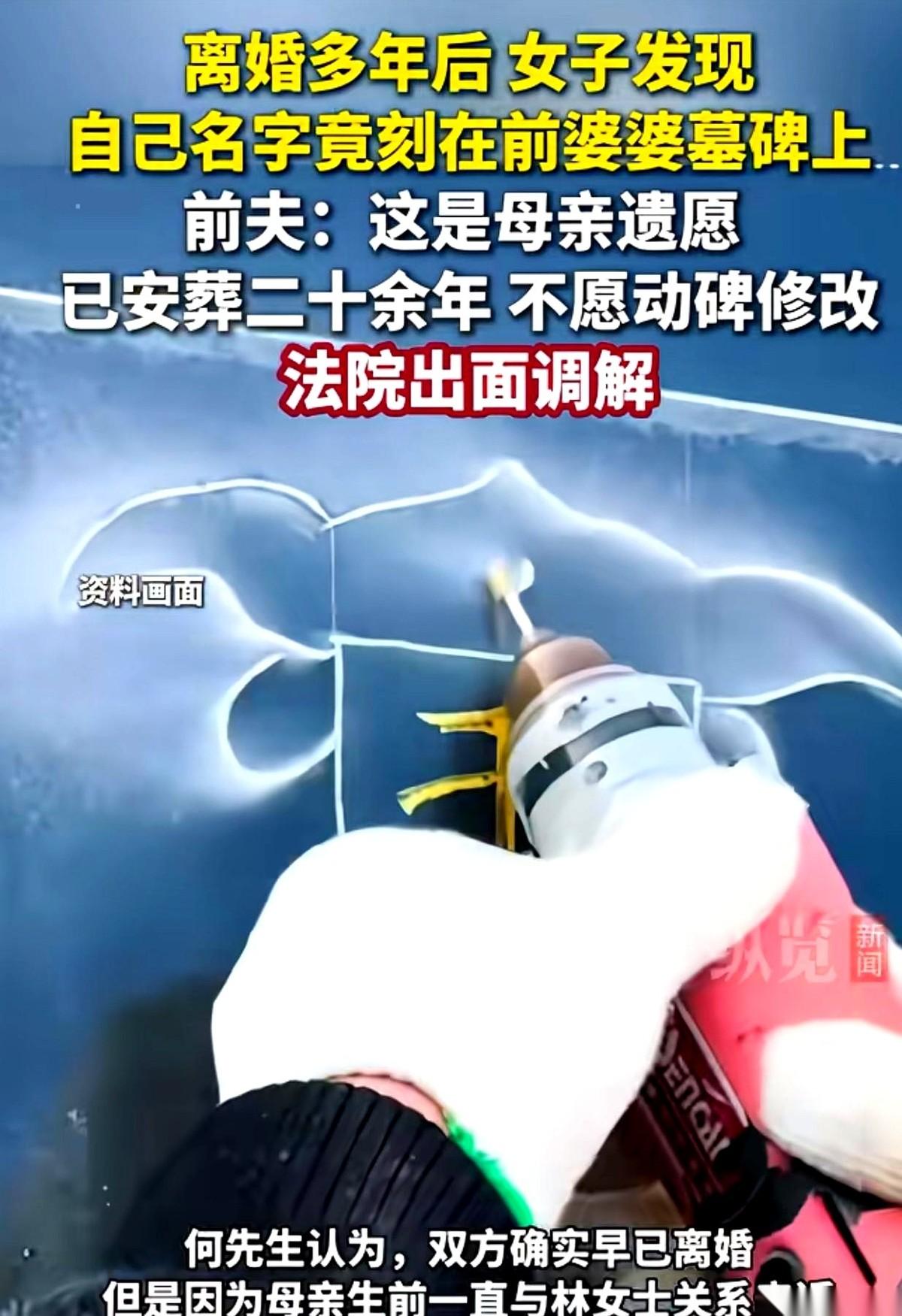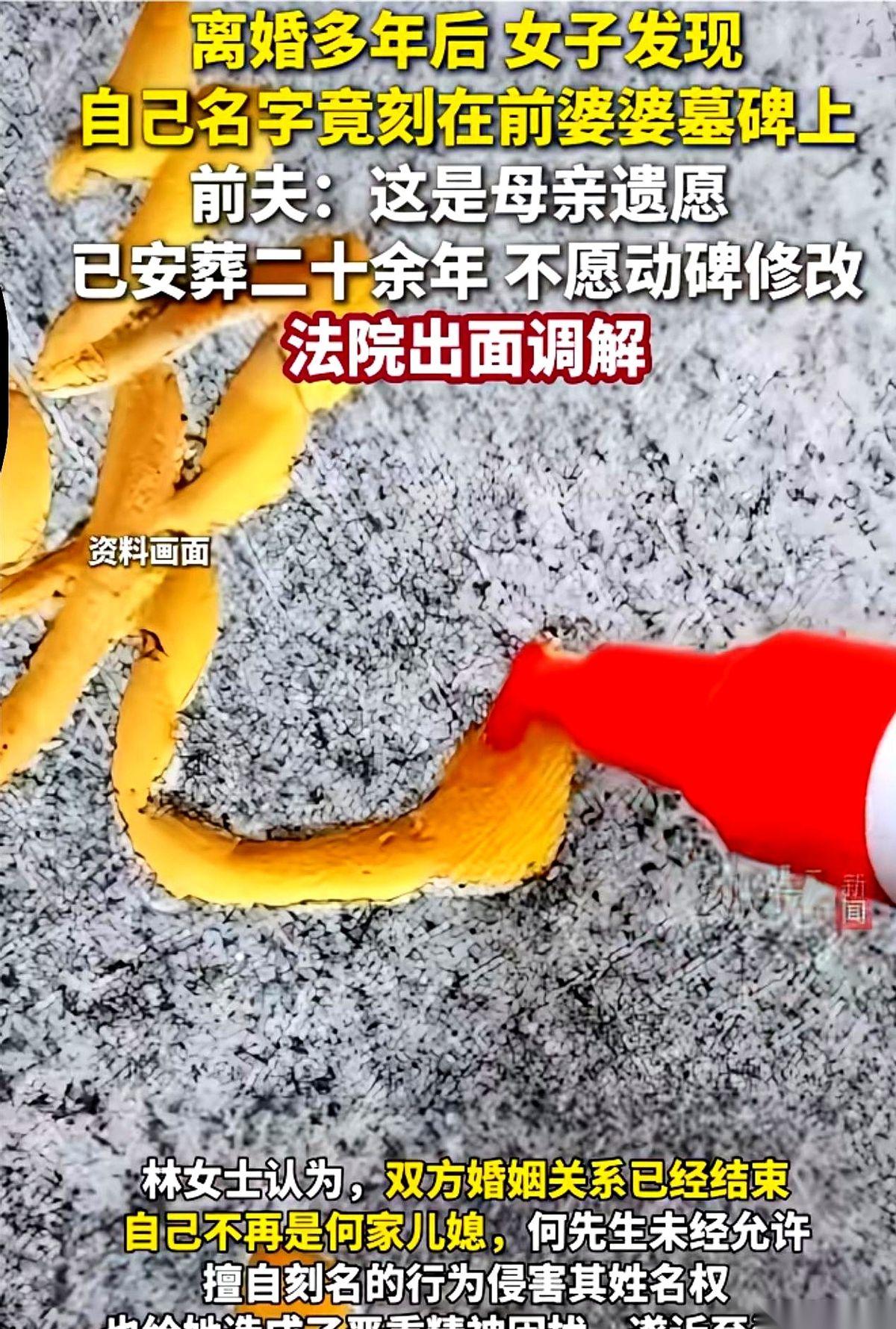 上海一个阿姨,跟前夫离婚三十多年了,日子过得好好的。 结果清明节,女儿去给前奶奶扫墓回来,一进门脸色就不对。她放下包,小声说:“妈,前奶奶的墓碑上,怎么还刻着你的名字?” 阿姨当时正在厨房,手里的锅铲悬在半空。 女儿又补了一句:“名字旁边,还清清楚楚刻着‘儿媳’两个字。” 锅铲“哐当”一声掉在灶台上。 这叫什么事?离婚三十多年,早就不是一家人了,自己的名字,怎么就无声无息地“住”进了别人家的祖坟里?一住还是二十多年,自己竟然最后一个知道。 阿姨抄起电话就打给前夫老何,声音都在抖:“你凭什么把我名字刻上去?谁给你的胆子?” 电话那头,老何的声音不紧不慢。他说,那是我妈临终的遗愿,老太太到死都认你这个儿媳妇,她交代了,墓碑上必须有你的位置。 “遗愿?”阿姨气得发笑,“咱俩离婚证还在抽屉里呢!她有遗愿,我就得答应?你问过我一句吗?” 老何在那头沉默了。然后就是一句话,翻来覆去地说:“人都走了二十年了,墓碑不能动,动了就是大不孝。” 道理讲不通。 林阿姨也不废话,一纸诉状直接递到了法院。要求很简单:第一,把名字给我抹了。第二,精神赔偿。 法官把俩人叫来调解。 对着老何,法官把法条摊开:“老哥,你孝顺没错,但你妈的遗愿,不能大过活人的权利。人家不同意,你这就是侵权,官司打到底,你百分百输。” 又转头劝阿姨:“他也不是存心恶心你,就是一根筋,觉得老娘的话就是圣旨,脑子没转过来。” 几轮下来,老何的额头也见了汗,终于松了口。 阿姨也退了一步,说只要名字能弄掉,赔偿一分不要,就当这三十年的晦气,一次性了断。 最后签了调解书:老何一个月内,必须把墓碑上的名字处理干净,再给一笔补偿金,这事就算翻篇。 说白了,孝顺归孝顺,但不能拉着一个早就没关系的人,去给自家祖宗“陪葬”。你的名字,只有你自己能签字。