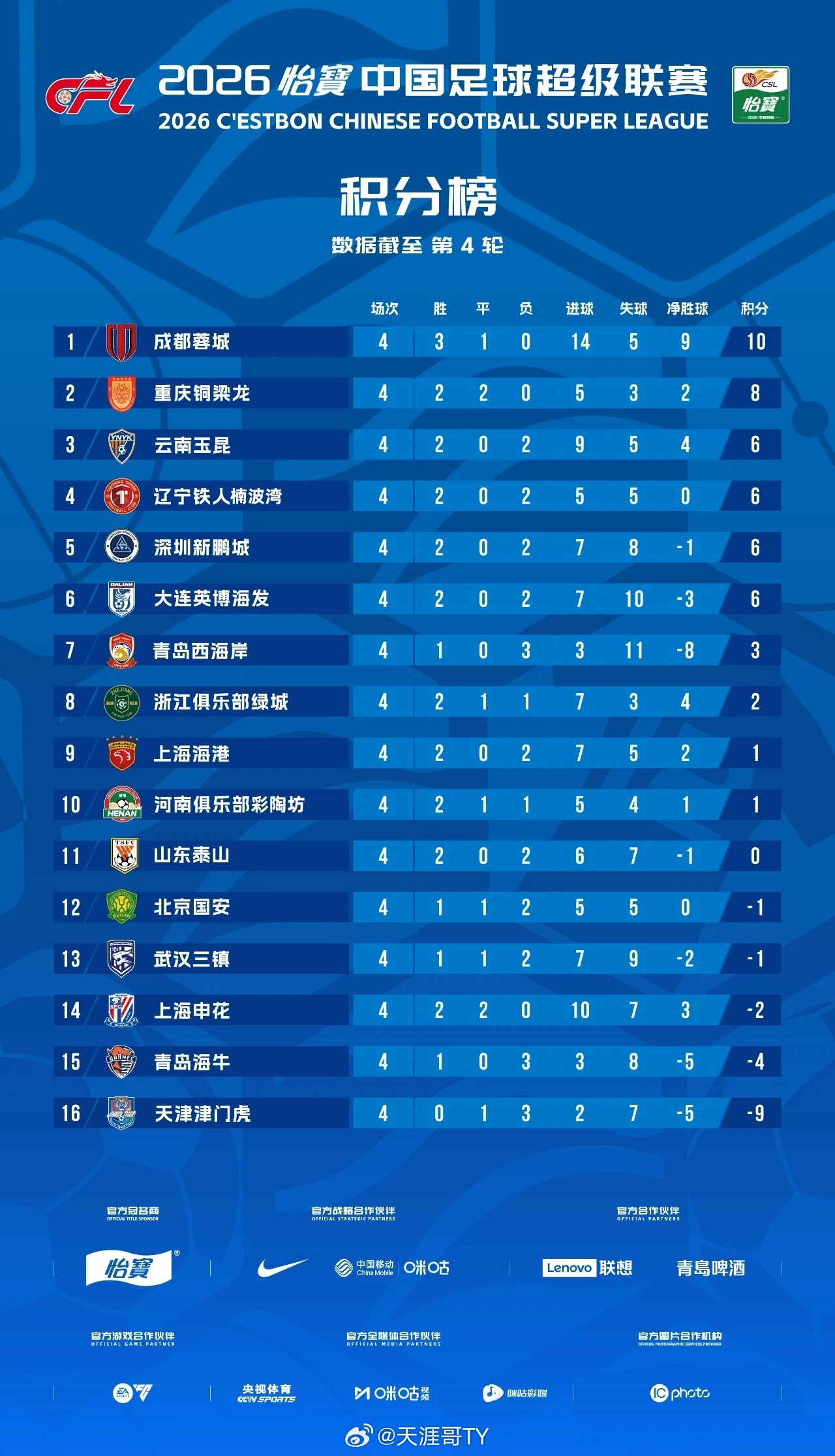 山东泰山 2026年中超联赛第四轮全部战罢,第四轮战绩【图1 】截止第四轮各俱乐