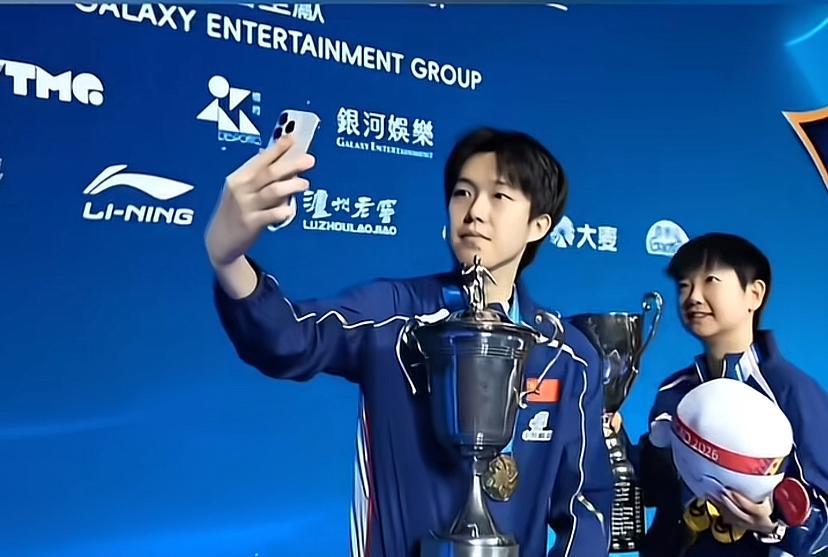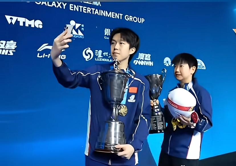 孙颖莎不但没有拍照, 还跟王楚钦聊着, 莎莎跟大头的奖杯不一样, 少了个盖子。 莎莎流露出孩子般的开心, 王楚钦微笑恰到好处。 两人再一次一起来到顶峰, 想起此前拌嘴。 可能以后一起合影, 都是王楚钦拍照了。 男孩子, 拍照很好。 我女儿就嫌弃我拍照技术不行, 两人男俊女美, 咋拍都好看。