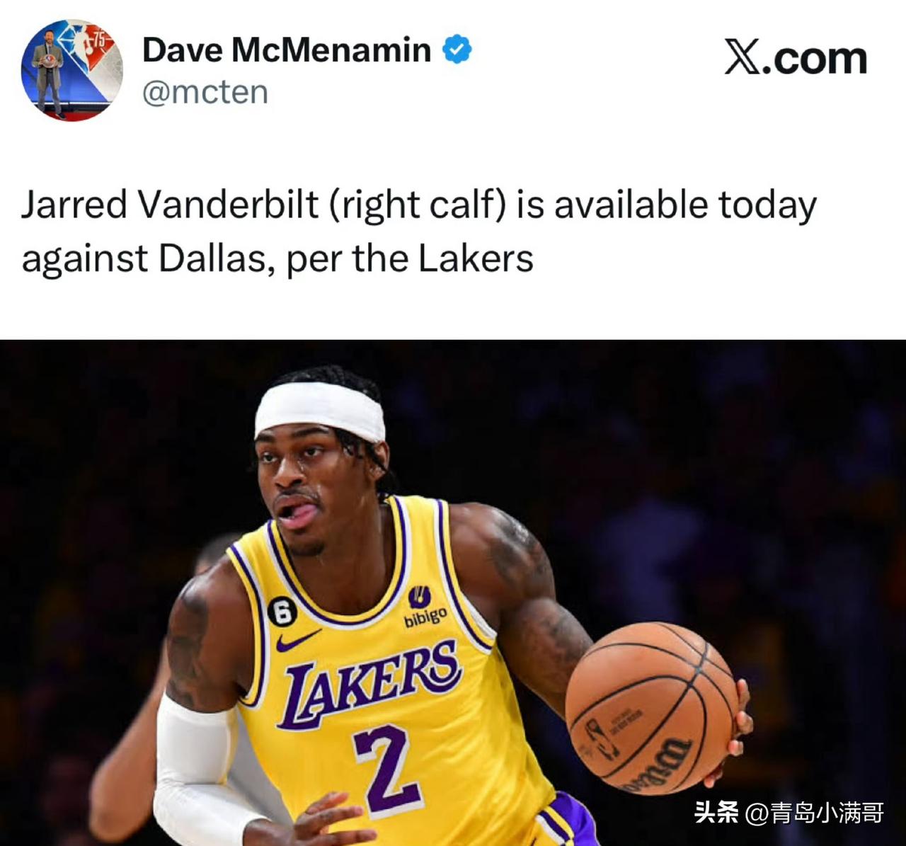 今天一大早,湖人官方就更新了消息,球队前锋范德比尔特(右小腿伤势)状态升级,他可以出战和独行侠的比赛。