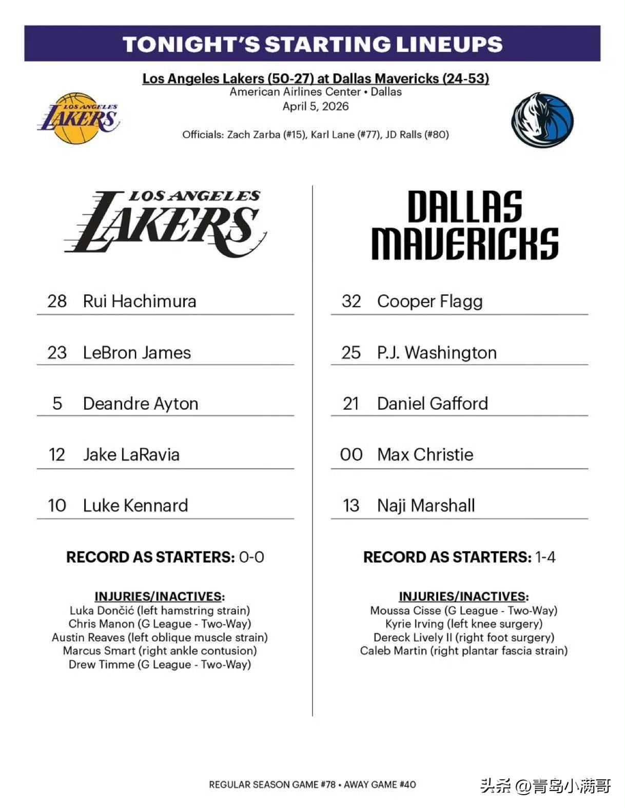 独行侠首发:弗拉格、克里斯蒂、马绍尔、华盛顿和加福德。