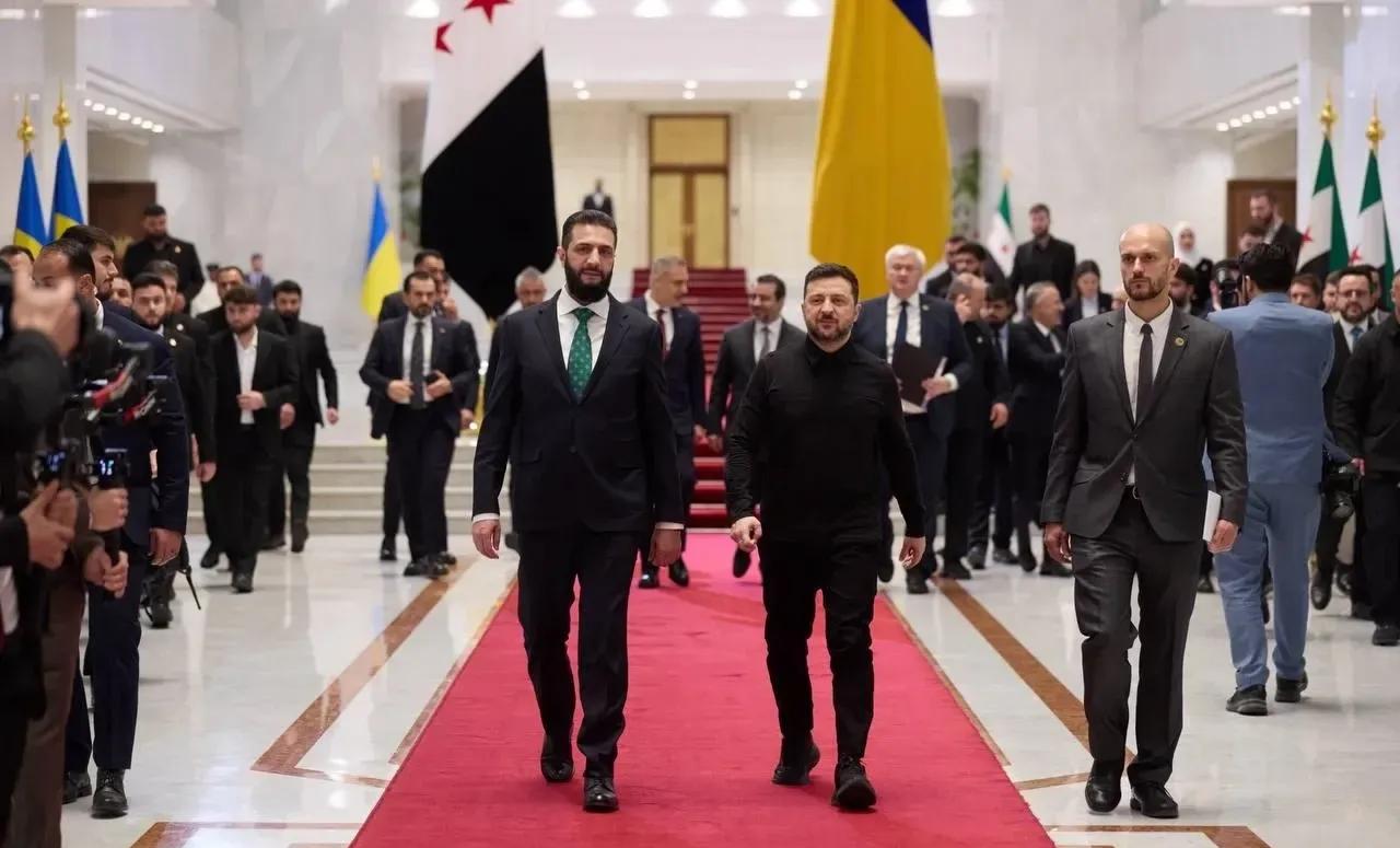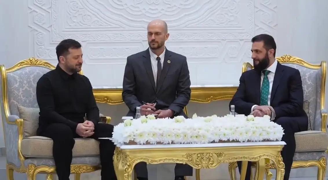 乌克兰总统泽连斯基访问叙利亚,这是叙利亚前总统阿萨德被推翻后,第一个到访的外国总统,叙利亚可谓特别重视,不过乌克兰总统泽连斯基和叙利亚新政府领导人朱拉尼的翻译更加抢镜。 这个翻译大大的个人,不光走红毯,而且两人对话,都特别的抢镜,特别是朱拉尼和泽连斯基对话时,更是坐在了C位。