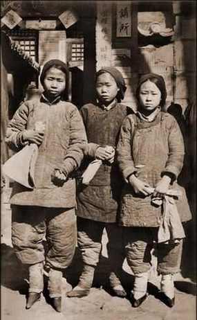 清末至民国初年,华北地区三名汉族年轻女性合影,三人都穿着厚重的粗布棉袄、扎腿棉裤,这是北方冬季的典型装束——既保暖御寒,又方便干农活、做家务,没有任何装饰。 三人都是三寸金莲小脚鞋,当时旗人女性不缠足,只有汉族女性普遍被要求缠足,哪怕是需要劳作的底层女性,三人神情拘谨、肃穆,面对镜头很不自然,摄影在当时是稀罕物,普通百姓极少接触,手里拿着纸包,大概率是结伴赶集、购物后,在店铺门口留影。