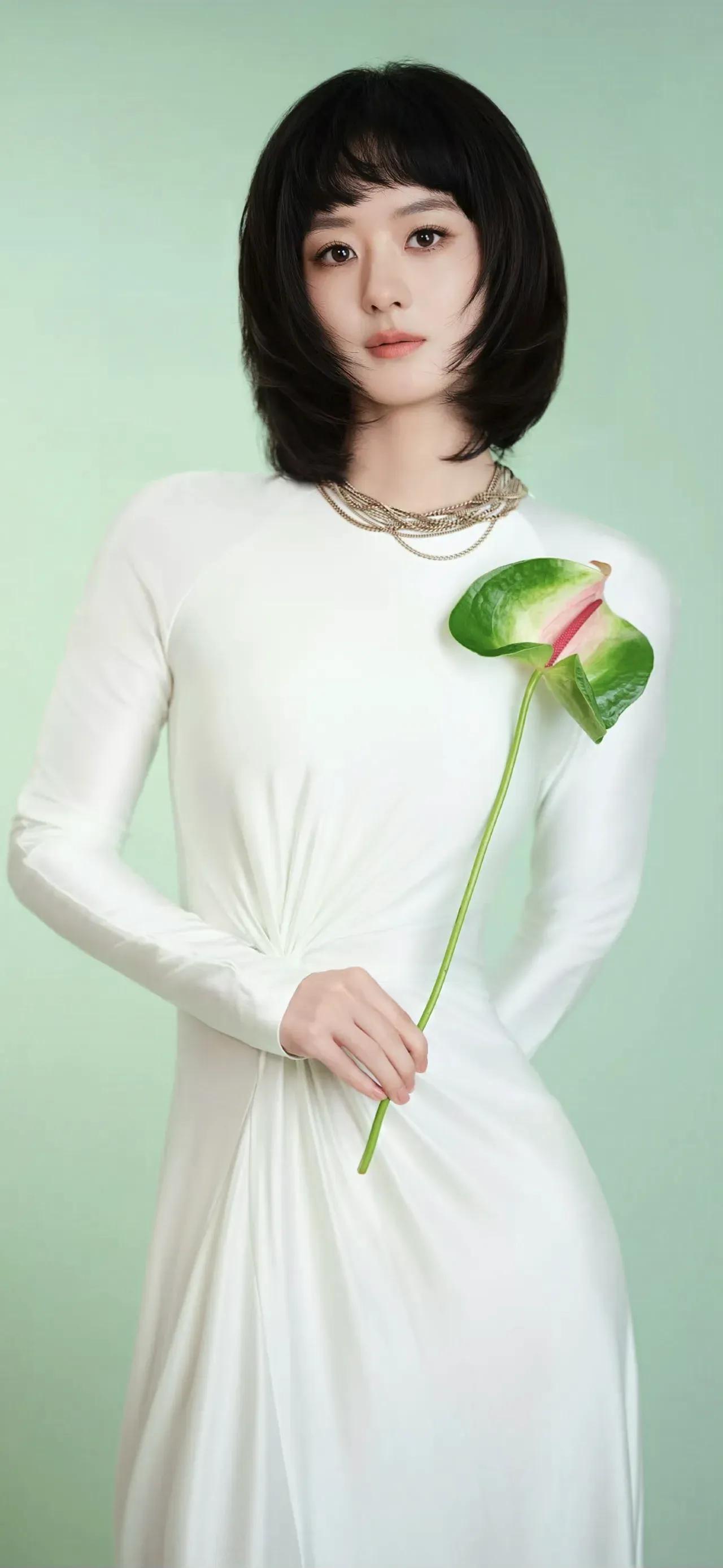 薄荷绿的底色里,白裙漾开温柔的涟漪。 利落短发衬出灵动眉眼,金链点缀出飒爽气场,