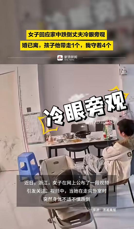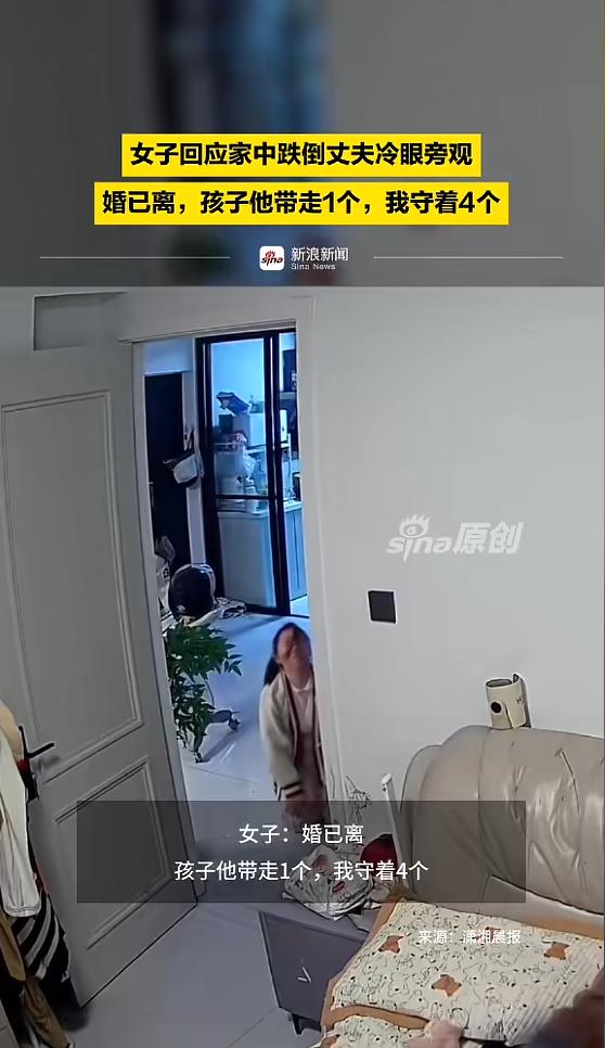 “这丈夫太无情!”近日,浙江,一女子在家中跌倒,丈夫看见后,冷眼旁观,动都没动一下,最后还是女子自己挣扎着爬起来,通过这件事,女子彻底寒心,决定和丈夫离婚,从今以后自己一人带着孩子好好过!网友:这个决定是对的! 最近浙江发生的一件事,在网上吵得沸沸扬扬,看过监控的人,几乎都忍不住替当事人寒心,一场不起眼的跌倒,把一段十年婚姻里的冷漠,暴露得一览无余。 事情的主人公是一位宝妈,她不是浙江本地人,是从江西远嫁到四川,后来跟着丈夫一起去浙江发展,这一待就是十年。 这十年里,她没怎么回过娘家,一门心思扑在家庭上,先后给丈夫生了五个孩子,成了全职妈妈,每天的日子就是围着孩子和家务转,从早忙到晚,连片刻休息的时间都没有。 事发那天,她和往常一样,早起给五个孩子做早餐送适龄的孩子上学,回家后收拾家务、洗衣服、照顾两岁的小女儿,中午简单吃口饭,又马不停蹄地准备晚餐、洗孩子的奶瓶衣物,全程连坐下来喝口水的功夫都没有。 其实那天她身体就不太舒服,总觉得头晕目眩,但想着孩子们没人照顾,家里的琐事也没人接手,就一直强撑着,没跟丈夫提半句。 等到忙完手头的活,她打算去卧室休息片刻,顺便照看正在午睡的小女儿,可刚走到距离沙发几步远的地方,一阵强烈的头晕袭来,她双腿一软,重重地摔在了地上,背部和腿先着地,发出一声沉闷的声响。 摔倒后她疼得浑身发紧,眉头皱成一团,挣扎了好几次,都没能爬起来,只能趴在地上,眼神里满是无助,心里还抱着一丝期盼,希望丈夫能伸手扶她一把,可她的丈夫,就坐在不远处的沙发上,清清楚楚地看到了这一切。 他没有惊讶,没有心疼,甚至连眉毛都没动一下,只是缓缓抬起头,冷冷地扫了她一眼,就又低下头刷手机,要么就是双手抱胸静坐,仿佛地上摔倒的不是跟他过了十年、生了五个孩子的妻子,只是一件无关紧要的东西。 最让人揪心的是,两岁的小女儿被摔倒的声响惊醒,看到妈妈趴在地上,瞬间吓得小脸煞白,哇哇大哭着冲过去,用稚嫩的小手拼命摇晃妈妈的身体,嘴里含糊地喊着“妈妈”。 可即便这样,丈夫依旧不为所动,连朝母女俩瞟一眼都没有,耳边的哭声、眼前的画面,仿佛都跟他没关系,女子在地上趴了足足几分钟,没有得到丈夫一句询问、一次帮扶,心里的最后一丝希望彻底破灭了,只剩下深入骨髓的寒意。 最后,她凭着残存的力气,咬着牙,一只手撑着地面,一只手扶着墙壁,艰难地慢慢站起身,几次都差点再次摔倒,却再也没有看丈夫一眼。 那天剩下的时间,她没跟丈夫说一句话,沉默地安抚好小女儿,继续处理没做完的家务,晚上也独自带着小女儿休息,没有再和丈夫同处一室。 经过这件事,她彻底寒心了,当晚就悄悄翻看了家里的监控,再次看到丈夫冷眼旁观的画面,更加坚定了离婚的决心。 现在,两人已经办理了离婚手续,五个孩子里,前夫带走了大女儿,她自己带着剩下的四个孩子生活。 有人说她傻,一个人带四个孩子太辛苦,可只有她自己知道,与其在一段冰冷的婚姻里消耗自己,不如及时止损,哪怕苦一点、累一点,也能带着孩子过踏实日子。 网友们看到这件事,也都纷纷表示支持她的决定,有人说,陌生人摔倒还会扶一把,更何况是自己的妻子,这样的男人根本不值得托付。 其实婚姻到最后,拼的从来不是富贵,而是遇事时的相互扶持。这一跤,摔疼了她的身体,却也让她看清了身边人的真心,这样的婚,离得真的太对了。