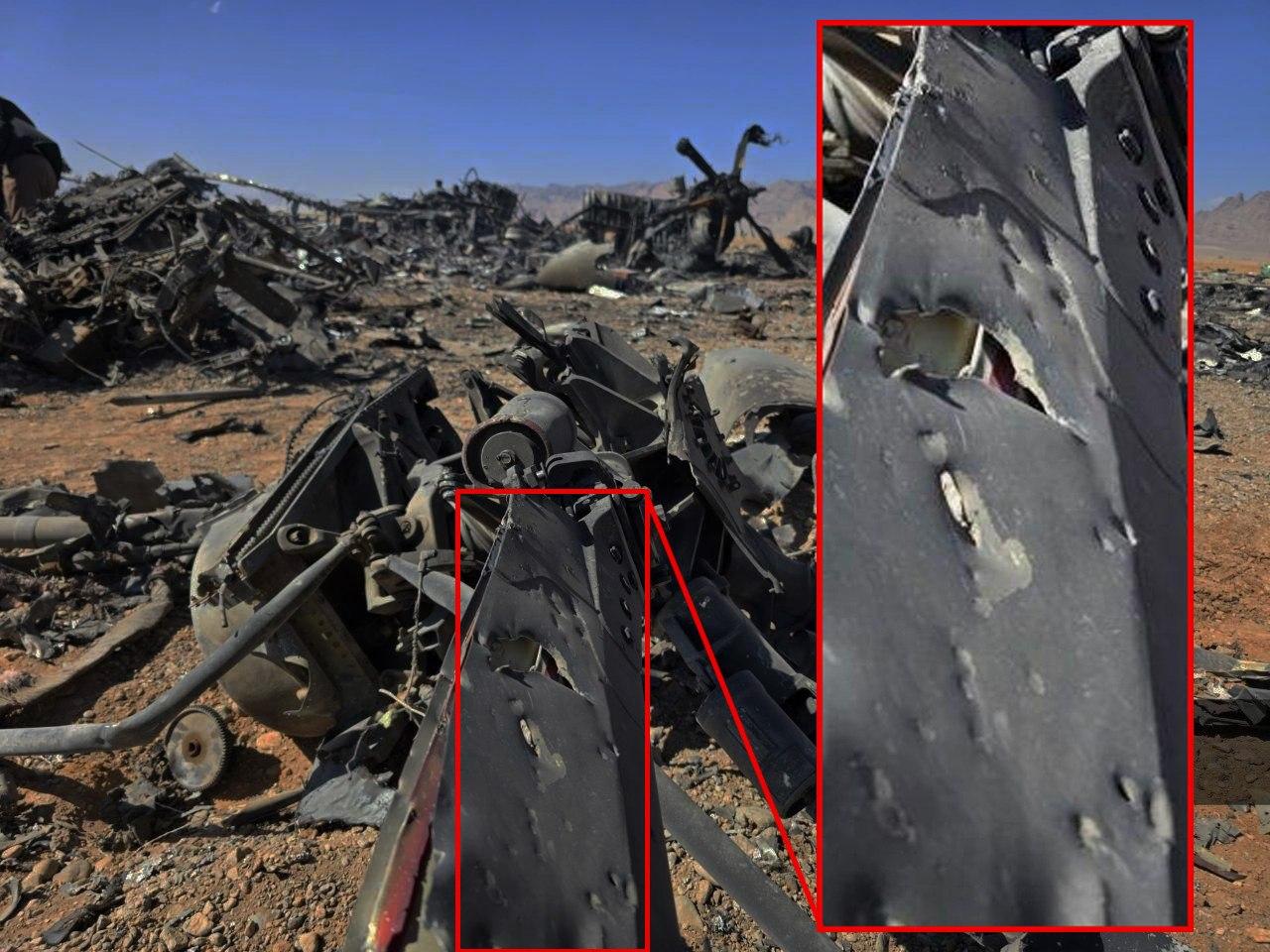 有证据显示被炸毁的MC-130有可能之前就受了重伤,从照片看某一台被拍摄到的发动机螺旋桨全部弯曲,证明这台螺旋桨在旋转过程中直接接触到了地面或者其他遮挡物,这个现象玩战雷的朋友应该能更好的理解。另外机身上出现了大量大大小小的孔,有的不规则,但是有的形状是近似规则的圆形而且较为密集,像是被子弹打穿。 所以其实他们是因为自身原因飞不起来了而不是陷在沙子里这么简单。只是美军又补了一枪然后声称是自己主动摧毁的掩盖了飞机本身损伤。
