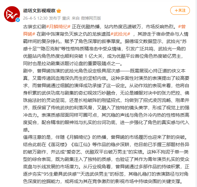 曾舜晞上桌曾舜晞新剧口碑 曾舜晞月鳞绮纪饰演的龙族遗孤武拾光,角色层次丰富、苏感十足,角色热度破亿,成优酷首位角色热度破亿男主,他达成双平台破万男主实绩,夯实武侠男主标签,尽显市场潜力!!(物料cr网络)