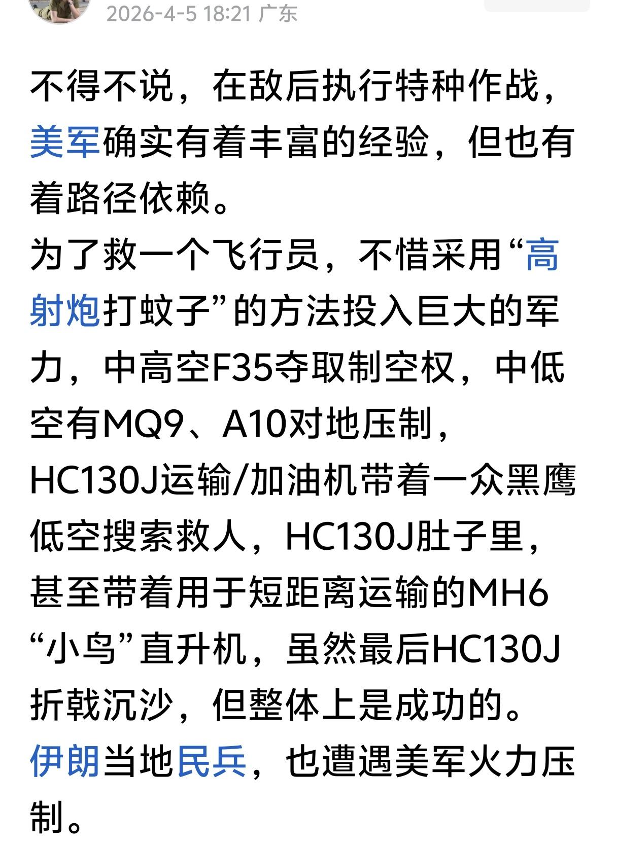 嘲笑美军是“路径依赖”? 这可不是高射炮打蚊子 是妥妥的教科书级敌后救援! 从F35制空到A10清场 从黑鹰突防到地面搜救 环环相扣的体系配合 不是僵化套路 是拿命练出来的安全冗余。 救回两名飞行员的背后 是不抛弃战友的底气 更是现代战争里 用绝对体系优势托住生命的硬实力。 这不是浪费 是对前线官兵最硬核的承诺。