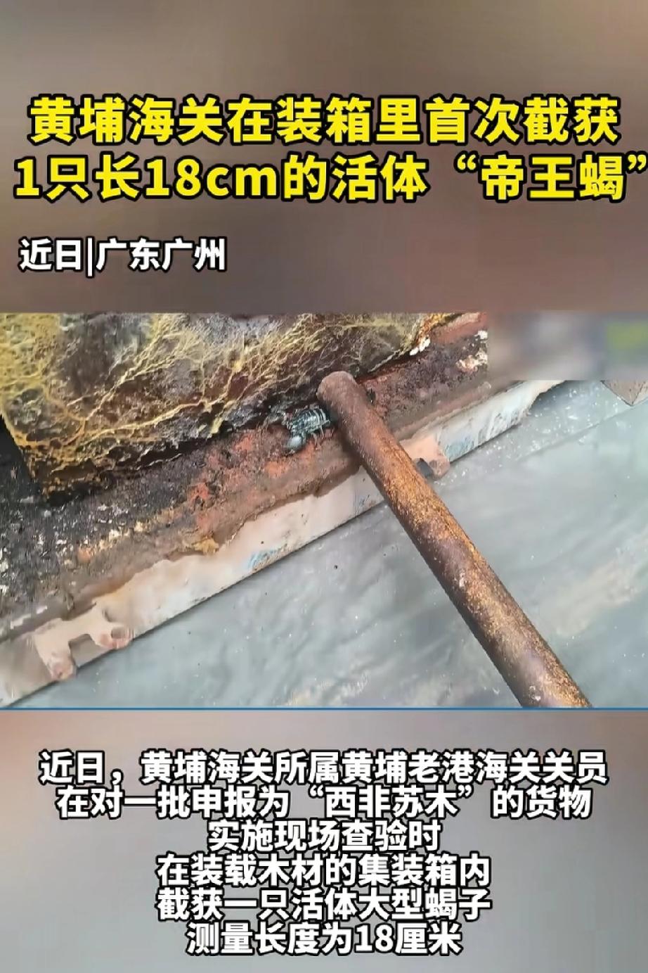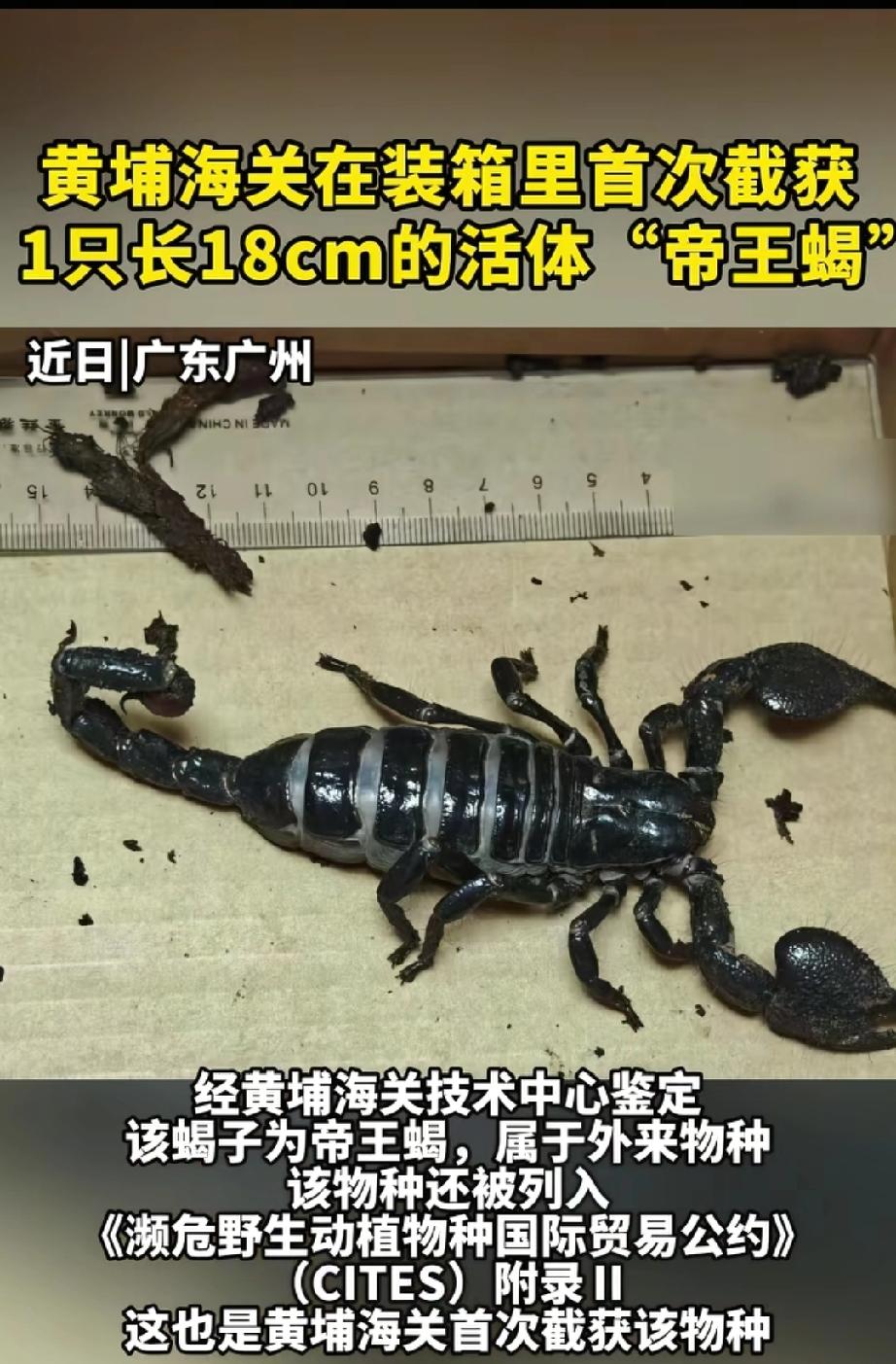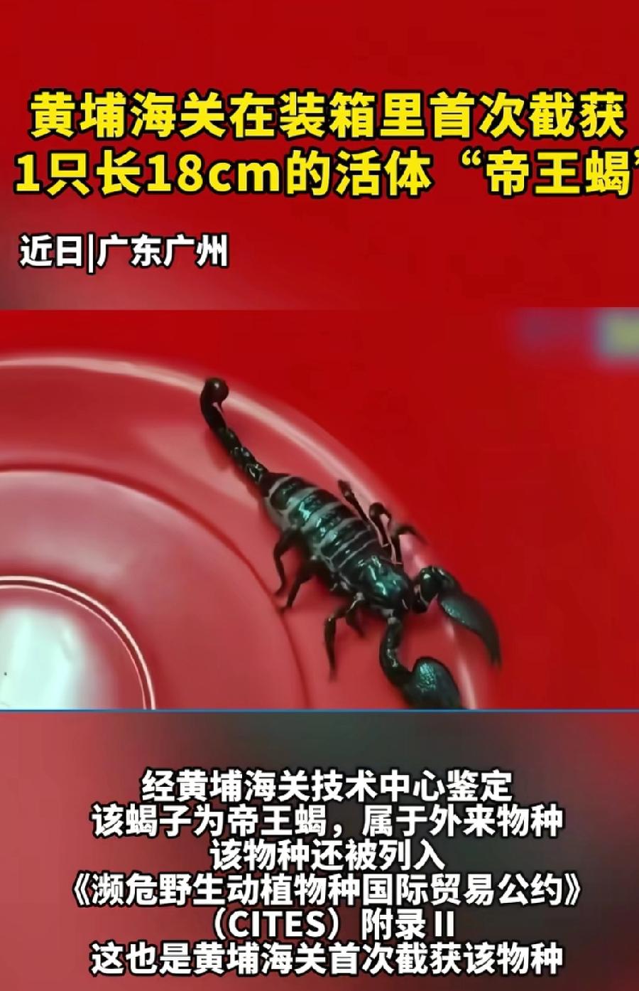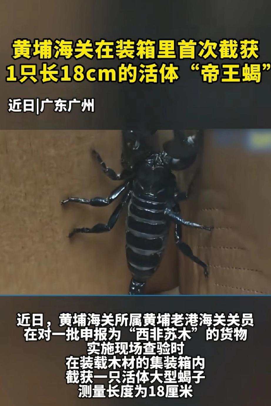 海关截获18厘米长活体帝王蝎。 2026年4月4日,广州黄埔老港海关查验进口木材时出大事了!在申报为西非苏木的集装箱里,关员摸出一只18厘米长的活体巨型毒蝎,一鉴定是濒危物种非洲帝王蝎,这可是该海关首次截获。 帝王蝎作为非洲顶级掠食者,要是逃脱入境,没了天敌,会疯狂繁殖,捕食本土小动物,破坏生态平衡,还可能携带未知病原体威胁公共卫生。而且它是CITES附录Ⅱ保护物种,我国严禁擅自引进外来物种。这次截获给“异宠”爱好者敲响了警钟,别因猎奇心酿成生态灾难。必须给海关的细致排查点赞,他们守住了我们的安全底线! 黑尾蝎 商品蝎