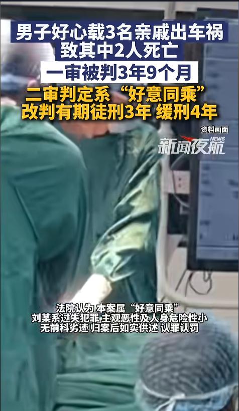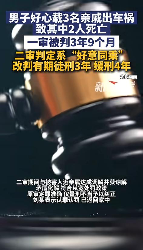 “悲剧还是发生了!”2025年5月,河南,一男子参加酒席后,好心开车带三位亲戚返回,结果高速路上却出了车祸,两位亲戚身亡,他和另一名亲戚也受了伤。事后,男子一审被判3年9个月。男子不服,提起上诉,近日,二审宣判了! 开车在路上千万不能分心,一旦出了事故,赔钱事小,搞不好就得进去坐牢,一下子好几个家庭就毁了。 据媒体报道,事发当日,男子刚参加完外甥的满月宴,出于好心,就免费开车,拉了三个长辈回去。可没想到,在高速上出了事故,和前面一辆慢速行驶的车辆发生了碰撞。两位长辈不幸身亡,他和另一个也受了伤。 事后,亡者的亲属表示不能谅解,就是他毁了他们的家庭。法院在审理之后,认为男子当时超速行驶,且存在分心驾驶驾驶的情况,对事故应负主责。判处男子有期徒刑3年9个月。男子不服,提起了上诉。 二审期间,亡者家属与男子又达成了和解。法院认为,男子与死者之间属好意同乘,且已经得到谅解,维持交通肇事罪罪名不变,改判有期徒刑三年,缓刑四年。 网友看后表示,不管判决结果如何,悲剧都是实实在在发生了,两条人命,两个家庭,应该引以为戒!出行安全不容忽视,驾驶更不能分心! 信息来源:《4月3日(发布),男子好心载3名亲戚出车祸致其中2人死亡,一审被判3年9个月,二审判定系“好意同乘”,改判有期徒刑3年,缓刑4年。》新闻夜航