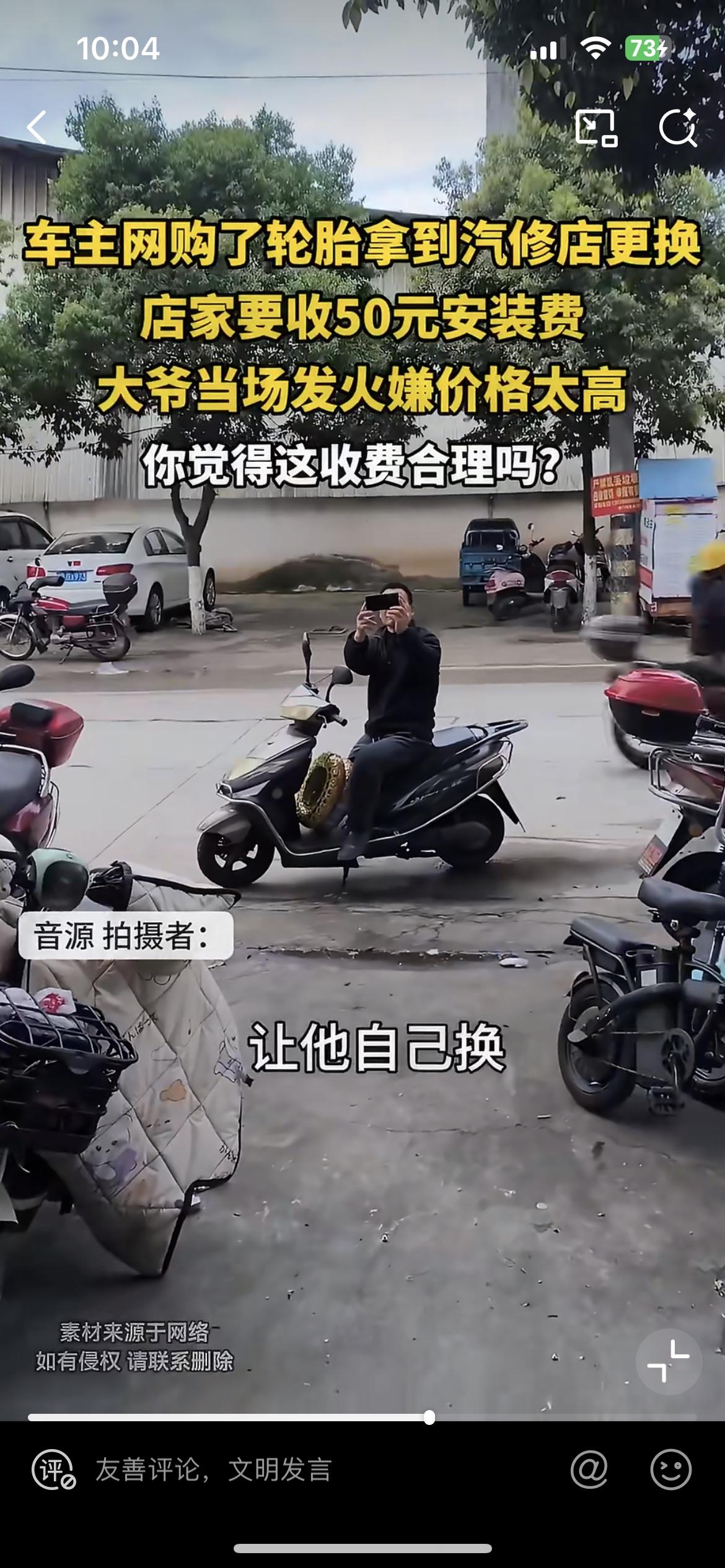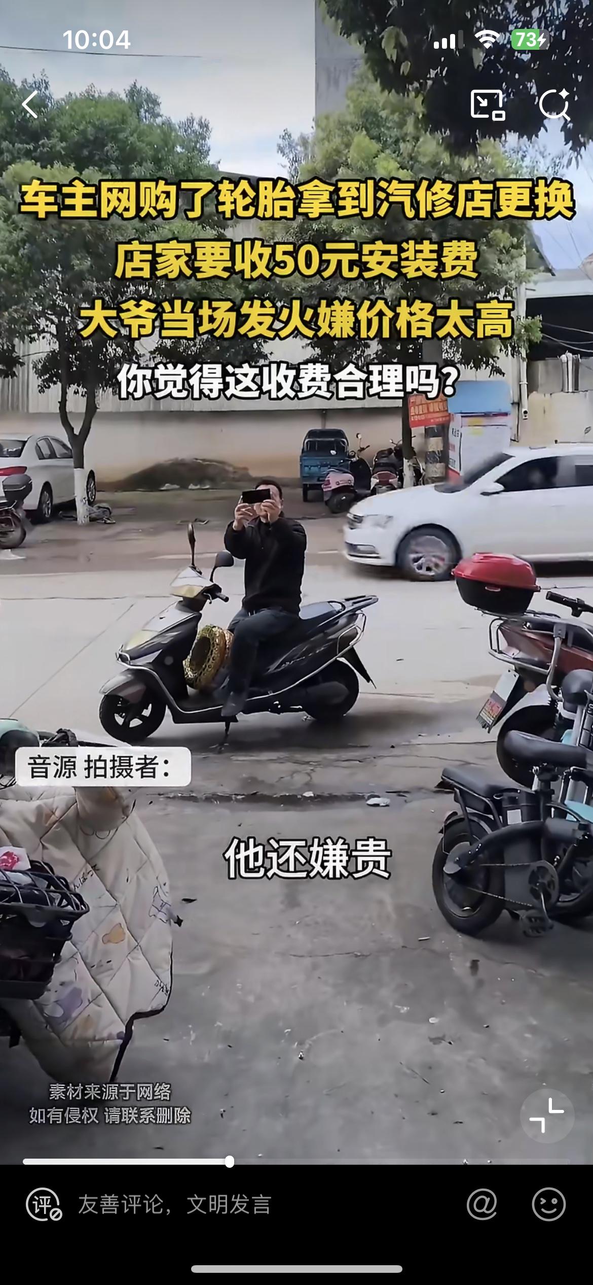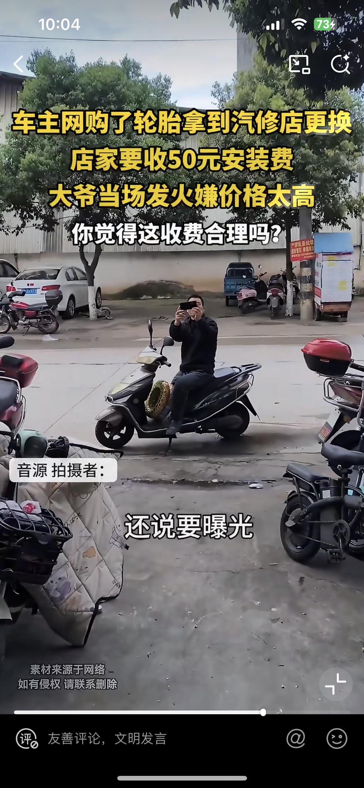 好离谱!图中端着手机的男子拿两个轮胎要店家换,店家要收他 50 块安装费,他却不干了。明显这种来料加工的人,本身就很鸡贼,就不想让店家赚轮胎的钱。自己没工具装不了,只能求助店家,店家收安装费合情合理,可是他却认为店家太黑了。不仅指责店家,还拿着手机拍店家的门头,说要曝光他。人家开店做生意,工具门面都是成本,拆装的服务要收费,合情合理,收费 50 块并不算多。如果你嫌贵可以换一家,何必要为难他。