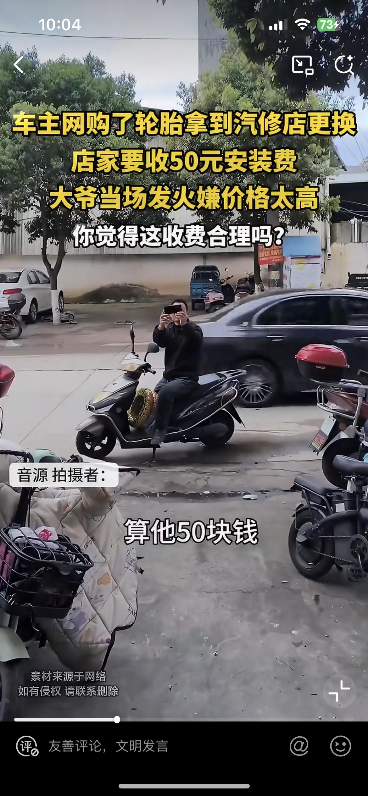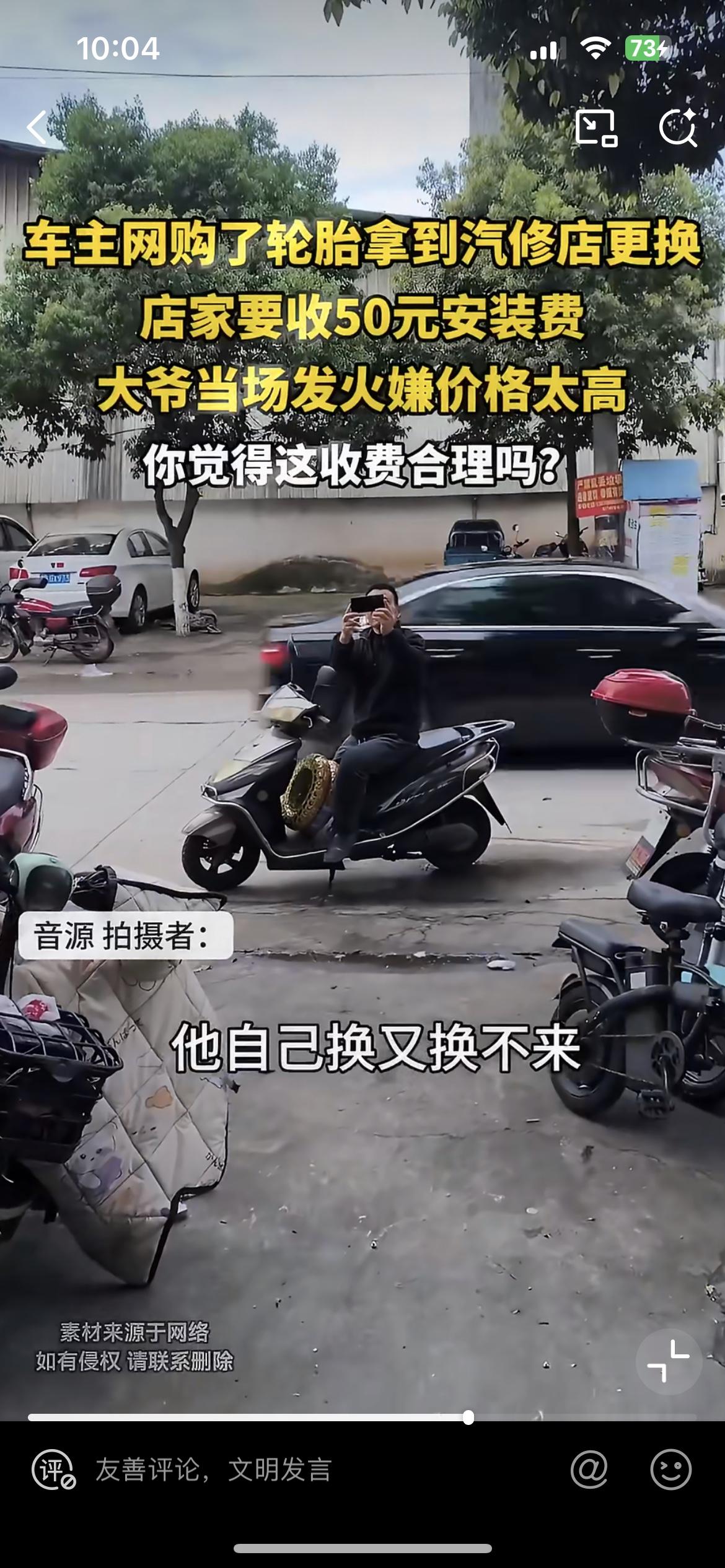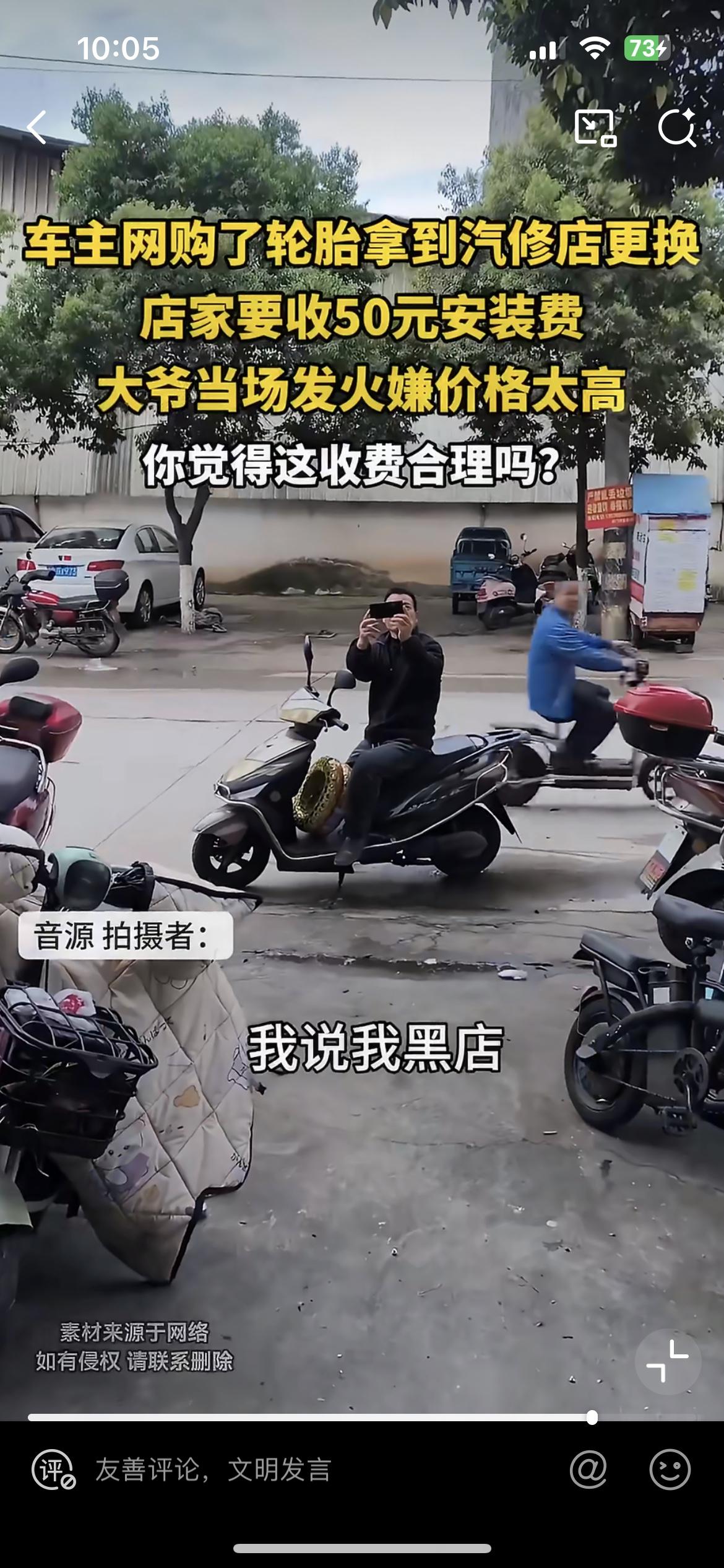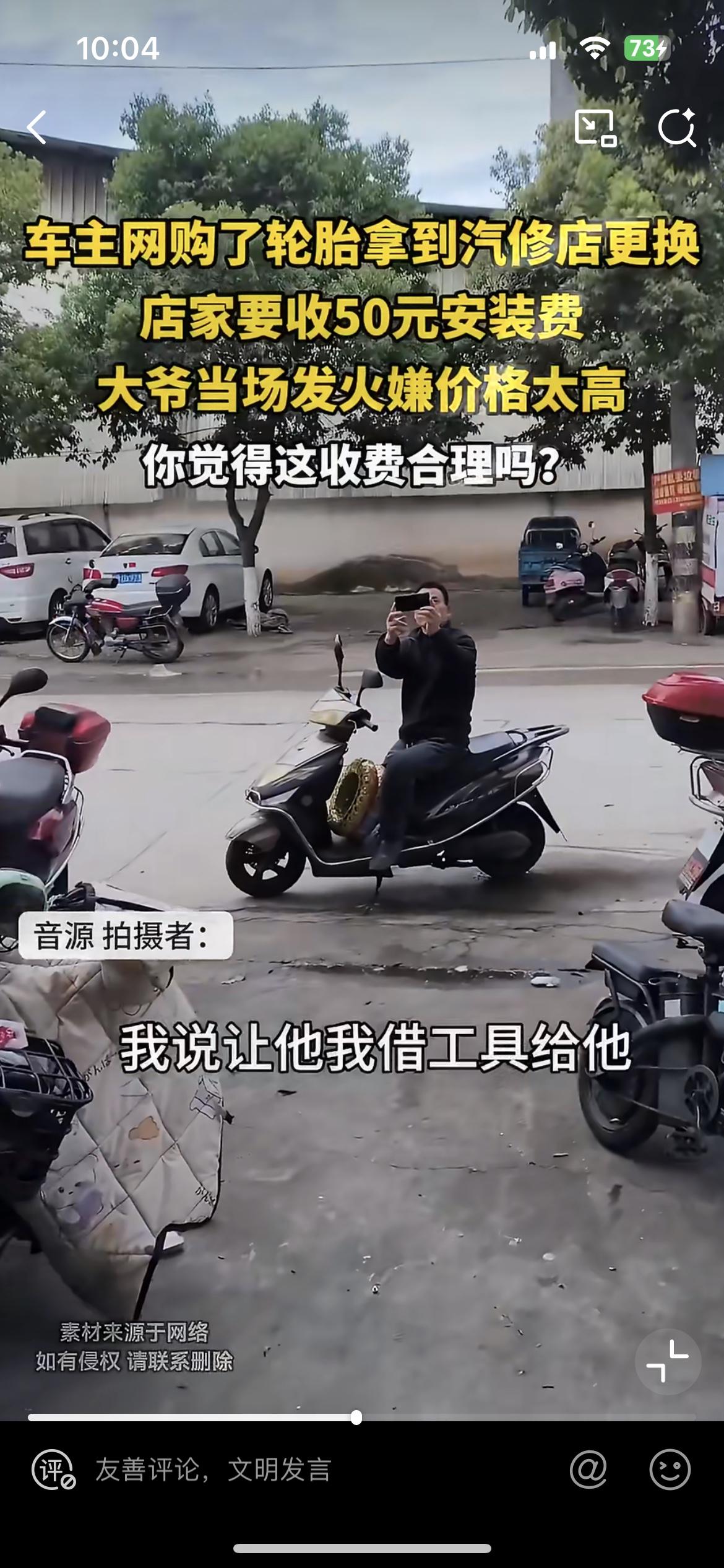 好离谱!图中端着手机的男子拿两个轮胎要店家换,店家要收他 50 块安装费,他却不干了。明显这种来料加工的人,本身就很鸡贼,就不想让店家赚轮胎的钱。自己没工具装不了,只能求助店家,店家收安装费合情合理,可是他却认为店家太黑了。不仅指责店家,还拿着手机拍店家的门头,说要曝光他。人家开店做生意,工具门面都是成本,拆装的服务要收费,合情合理,收费 50 块并不算多。如果你嫌贵可以换一家,何必要为难他。