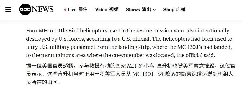 随着信息的不断增加,可以确认美军在昨天的搜救行动中损失了2架MC-130J“突击队员II”特种战飞机和4架“小鸟”特种战直升机。 MC-130J是美国空军在C-130J运输机基础上发展而来的多用途特种作战飞机,主要用于在敌对或敏感区域执行人员投送、撤离、补给以及为特种作战直升机提供空中加油等任务。‌‌MC-130J由美国空军特种作战司令部运营。 美方消息人士还透露,2架MC-130J被美军特战队员摧毁,不是因为地面松软,而是一架被伊朗人击伤,另一架没油了。这个解释就合理多了。 4架损失的“小鸟”直升机包括2架MH-6M和2架武装型AH-6M。之所以说有武装型AH-6M,是因为伊朗人在现场残骸发现了12.7毫米机枪弹链和70毫米“九头蛇”火箭弹,这两样武器是AH-6M装备的,MH-6M不装备。