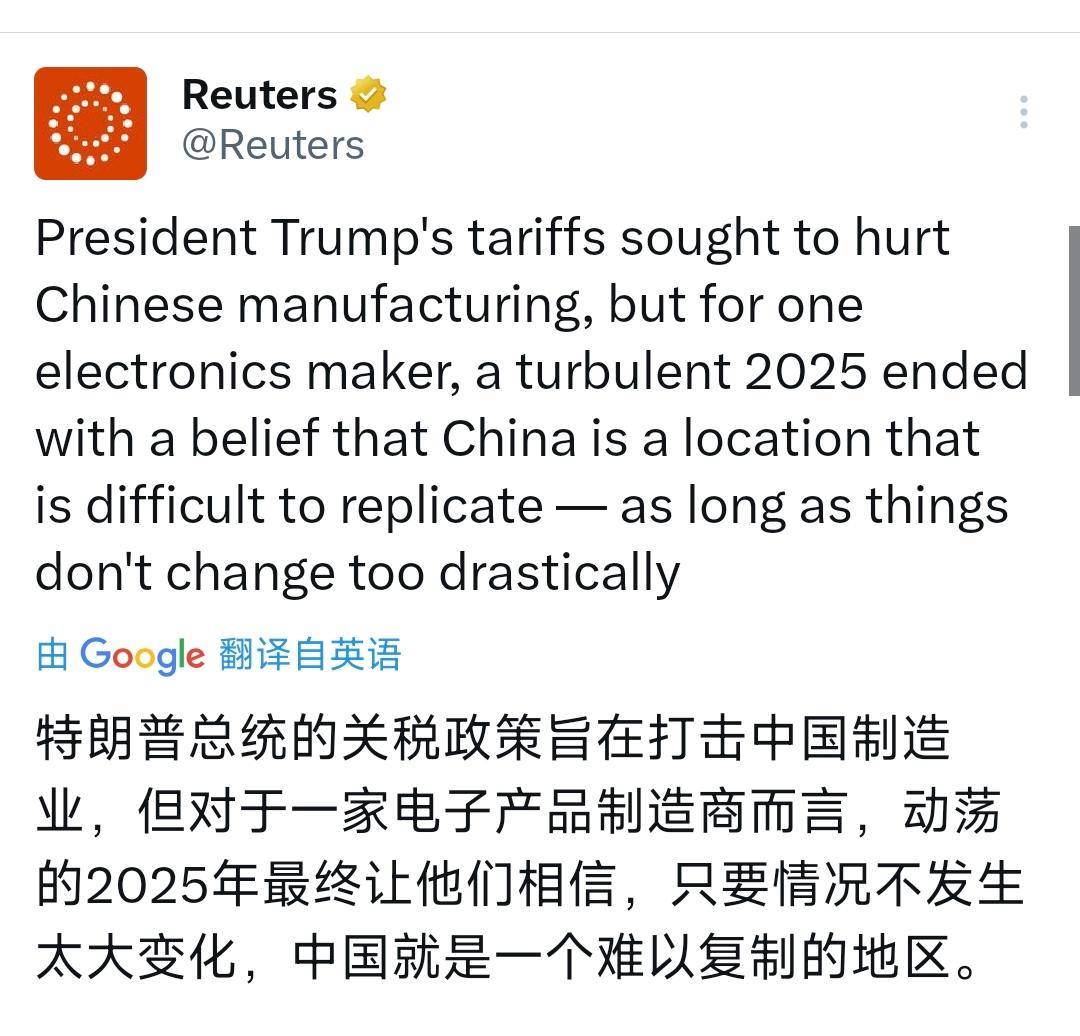 路透社今天(4月6日)写道:“特朗普总统的关税政策旨在打击中国制造业,但对于一家电子产品制造商而言,动荡的 2025 年最终让他们相信,只要情况不发生太大变化,中国仍是一个难以复制的地区。” [机智]评几句:中国的产业优势早已不是低成本,而是全产业链构筑的硬实力与不可替代性。这场自2025年起的关税闹剧,本想扼制中国制造业,却让很多企业看清了现实:中国拥有全球最完备的产业体系、高效的产业链协同能力与持续升级的创新生态,这是任何国家都无法在短期内复制的核心竞争力。