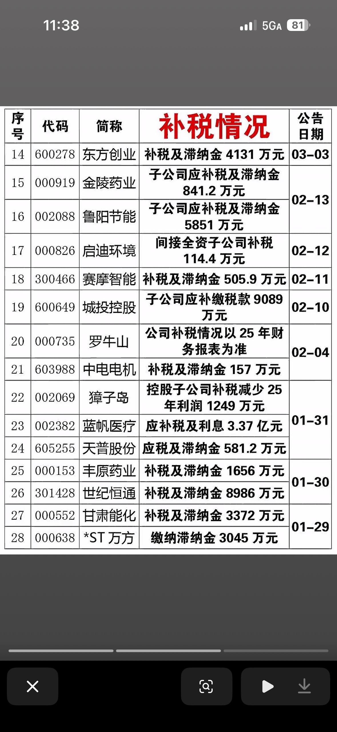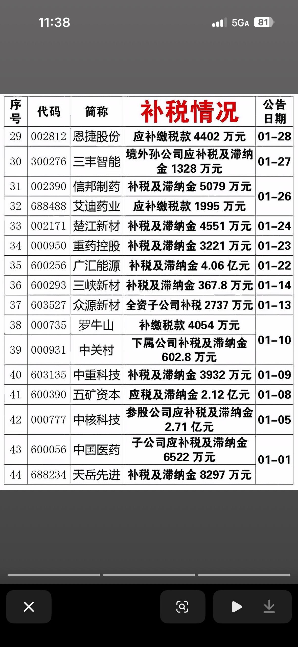 补税情况大公开!哪些公司被罚了? 补税情况真是备受关注啊!今年前11个月,税务部门动作可不小。查处了3904户高风险加油站,查补税款41.63亿元;还查处1818名包括明星网红在内的“双高”人员,查补税款15.23亿元。 上市公司里也有补税大户。XX股份控股子公司XX永清,补缴消费税、税金附加及滞纳金约1.66亿元;XX博汇化工补缴消费税、附加税费合计约4.79亿元。这都发生在财税部门扩大成品油消费税征税范围后,像混合芳烃、重芳烃等都要按石脑油征消费税了。看来企业和个人都得合规纳税,不然一不小心就“踩雷”补税啦!
