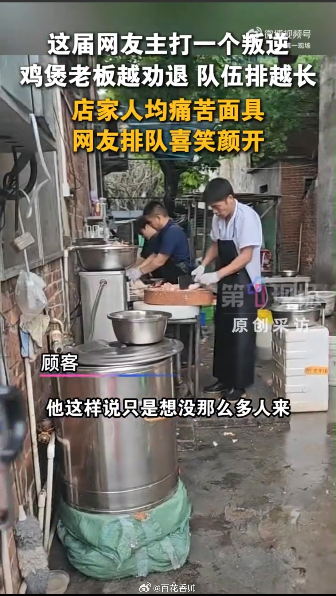 莫氏鸡煲店家人均痛苦面具原本莫氏鸡煲老板夫妇悠然掌勺,岁月静好。谁料探店后爆火,流量如潮水般涌来,直接把小店架在炭火上烤!食客们蜂拥而至,非要“尝个咸淡”,逼得全家老少齐上阵——少东家被急召回山,媳妇手都洗成了“白骨爪”,老板腰疼得直喊“饶命”。钱虽然赚了,快乐却没了。希望给老板留口真气,莫让这锅人间烟火成了“鸡”肋般的负担呀!