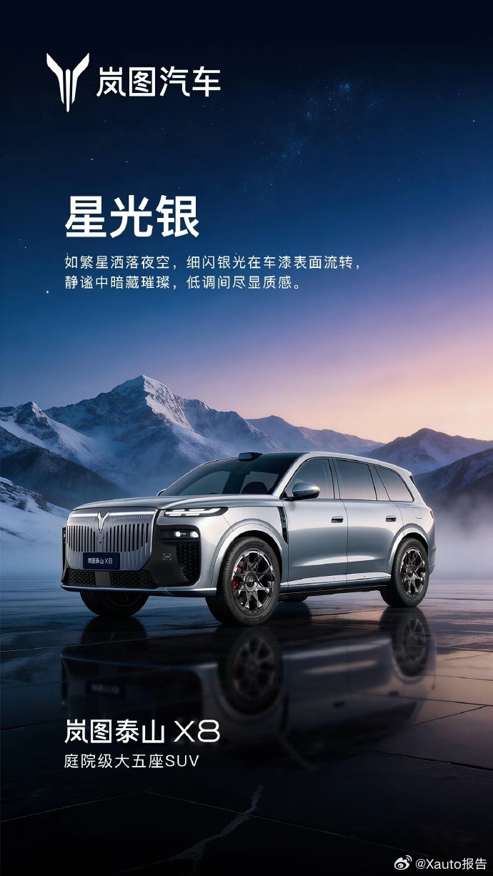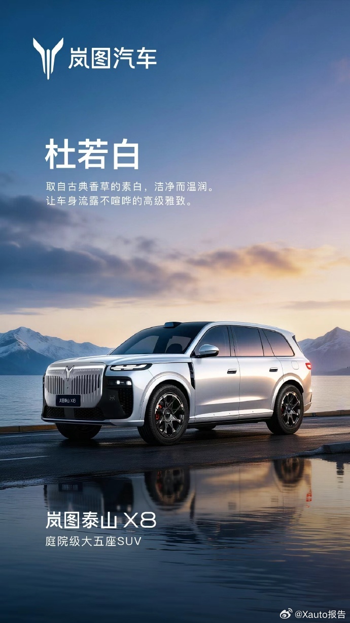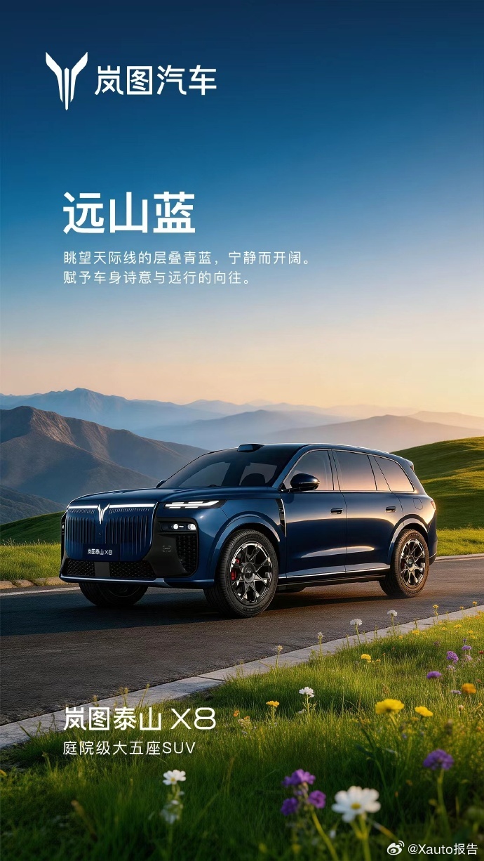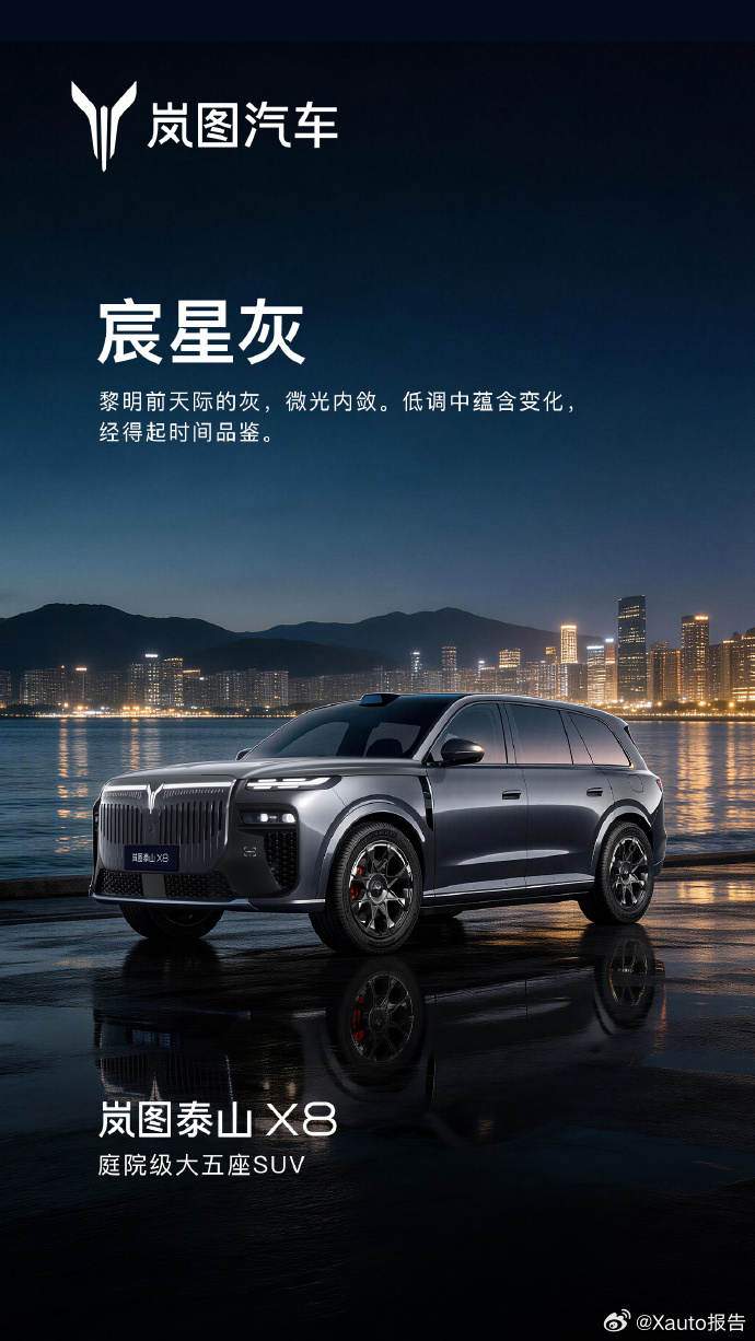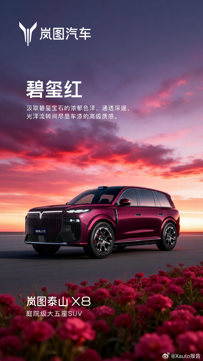 岚图泰山X8六款新车色亮相岚图庭院级大五座SUV泰山X8推出六款新车色,配色汲取