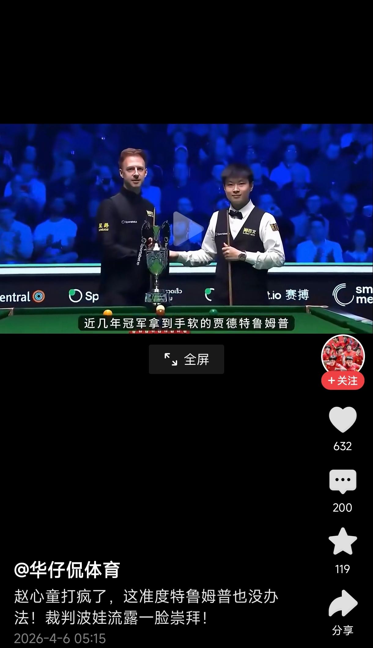 赵心童最近状态火爆,比赛中展现出了极高的准度和稳定性,连特鲁姆普这样顶尖选手也难以招架。裁判波娃在现场看到赵心童的精彩表现,忍不住流露出一脸崇拜,足见赵心童的实力和魅力。这样的表现不仅让球迷们兴奋,也让整个斯诺克圈对他刮目相看。期待赵心童继续保持状态,带来更多精彩的比赛!斯诺克热评