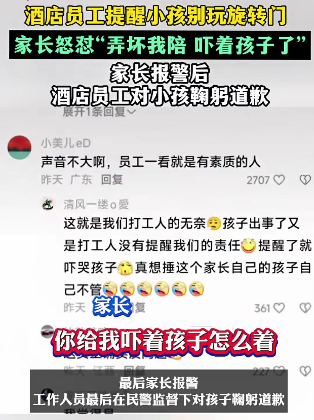 山东某酒店。 小孩玩旋转门,服务生提醒孩子不要玩,家长说服务生的声音太大吓到孩子了,报了警,警察认为服务生没有过激行为,为了尽快结束纠纷,要求服务生给孩子鞠躬道歉。原视频被酒店隐藏。 看得出来,无论是酒店还是警察,都不想让这件小事继续发酵。事实上,这件事已上了热搜。 当事人都不追究了,网民却揪着不放,为什么? 因为当事人是个孩子,他还没有产生正确的三观,如果父母认为孩子所做的一切都是对的,他很容易是非不分,警察叔叔的推波助澜,貌似促进社会更和谐,实际呢?