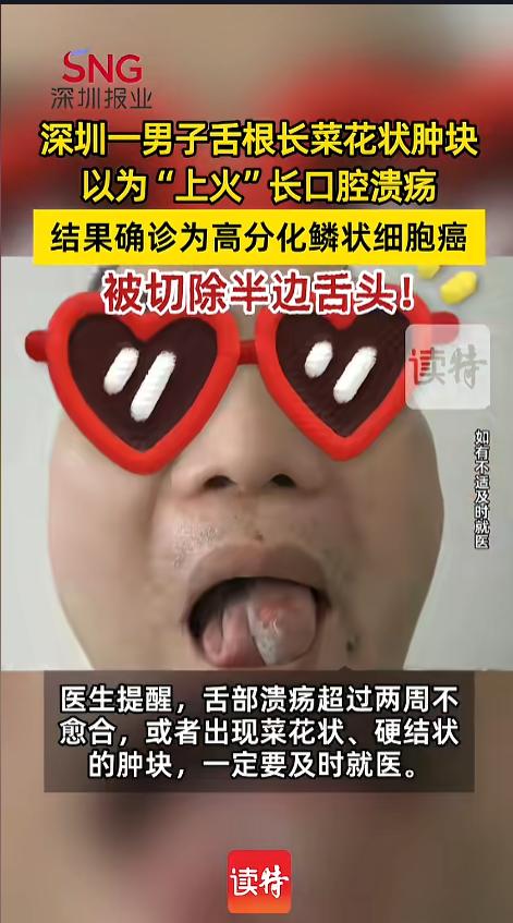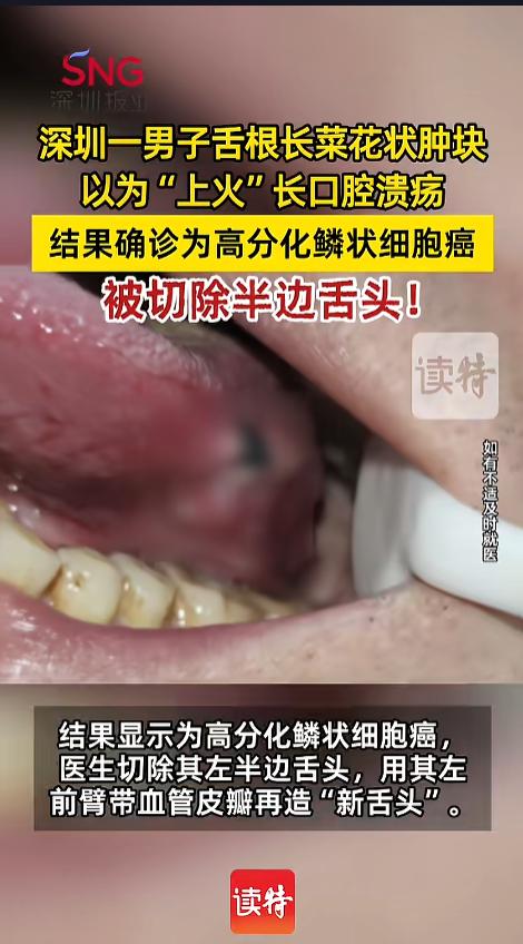 “悲剧还是发生了!”近日,广东深圳,一男子舌根上长了些菜花状的凸起,他以为是上火起了溃疡,就自行吃了些治溃疡的药,可没想到,溃疡不仅没好,反而长得更大了。他这才去了医院治疗,结果竟是个癌症,半拉舌头都被切掉了! 据媒体4月5日报道,该男子今年41岁,最近一段时间,舌头上长了点小肿块,跟菜花一样,凹凸不平的。他也没有在意,只当是最近上火太严重,嘴里起溃疡了。 可没想到,一连好几天,这个“溃疡”都没有消掉,反而越长越大,他感觉不对劲,去了医院检查。检查结果却把他吓坏了。 医生检查后,给他确诊为高分化鳞状细胞癌。想治疗就得进行手术,把病灶切除,左半边舌头都得切掉。男子知道后十分沮丧,虽然切了舌头影响太大,但为了保命,只能选择切除。没想到,柳暗花明又一村,事情又有新的转机。 医生将他的左半边舌头切除后,用他的左前臂带血管皮瓣,给他重新造了一条舌头,补上了切除的部分。男子的日常生活并不会受到太大的影响。 网友看后表示,现在科技也是进步了,之前就只能切,切了就没了,切了还不一定能彻底治好。现在切了都能再给补回去,对患者来说,实在是太利好了! 当然了,最好的情况还是平时多注意健康,让自己免受病魔的荼毒! 信息来源:《【深圳41岁男子舌根长“菜花”以为“上火”结果是癌】 医生切掉其半条舌》深圳新闻网