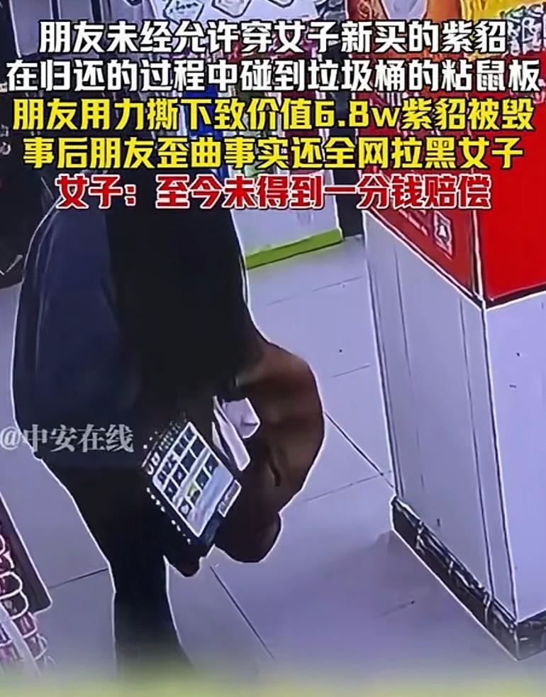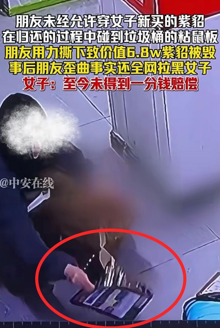 浙江一女子花6.8万买的全新紫貂,自己还没舍得穿一次,就被闺蜜彻底毁了,更气人的是,对方不仅一分钱不赔,还全网拉黑、倒打一耙!   最近浙江一位女士的遭遇让全网都替她气到发抖,花6.8万买的全新紫貂自己都没舍得穿一次,就被所谓的闺蜜彻底毁了,更气人的是对方一分钱不赔,还全网拉黑、倒打一耙,最后甚至甩出一句"请你拿律师来跟我对话"。   事情发生在4月初的浙江,这位女士刚入手一件价值6.8万元的紫貂皮草,那是她攒了很久的积蓄加上父母补贴才买到的心头好,拆开礼盒时都小心翼翼,连呼吸都放得很轻,一直没舍得穿,就等着合适的场合再上身。   4月5日那天,她的闺蜜来家里做客,一眼就看中了这件挂在衣柜里的紫貂,没经过她同意就擅自拿出来穿上了。   闺蜜穿着这件昂贵的皮草在屋子里来回走动,女士看着心里虽有不舍,但碍于情面也没好意思直接制止,只想着让她赶紧脱下来。   没想到在归还的时候,意外发生了——闺蜜随手把紫貂搭在沙发上,没注意到旁边垃圾桶里放着的粘鼠板,皮草一下子就沾了上去。   粘鼠板的粘性有多强大家都知道,尤其是对这种毛茸茸的皮草来说更是灾难。   更要命的是,这位闺蜜情急之下不是想着怎么小心处理,而是直接用力一扯,结果皮草上的毛和皮子当场就毁了,紫貂瞬间变成了"烂抹布",基本等于彻底报废。   看到自己心爱的新衣服变成这样,女士心疼得不行,可她还是强忍着情绪,想着闺蜜要是好好道歉、愿意赔偿,这事也不是不能商量。   没想到闺蜜的反应让她彻底心寒,不仅没有半点歉意,反而觉得她小题大做,还在别人面前歪曲事实,说女士早就想讹她钱,是故意把粘鼠板放在那里的。    更过分的还在后面,眼看着女士要讨个说法,这位闺蜜直接把她所有社交账号都拉黑了,电话也打不通,微信也发不了,彻底断绝了所有沟通路径。   女士好不容易通过共同朋友联系上她,希望能解决问题,得到的回应却是"请你拿律师来跟我对话,我也找了律师,让法律来判定"。    截至目前,这位女士一分钱赔偿都没拿到,连句像样的道歉都没有。   她把这件事曝光到网上,配上皮草受损的照片和聊天记录,很快就引发了网友的强烈愤慨。   有网友站在女士这边说:"这哪是什么闺蜜,分明就是来坑人的!未经允许穿别人贵重物品已经不对了,弄坏了还不赔,拉黑倒打一耙,这人品简直刷新底线,以后交朋友真的要擦亮眼睛"。    也有网友提出了不同看法:"虽然闺蜜做得不对,但女士自己也有责任,明知是贵重物品就该妥善保管,或者一开始就明确拒绝对方穿,现在闹到这个地步,友情没了,钱也没了,实在得不偿失"。    这件事之所以让大家这么气愤,不只是因为6.8万元的经济损失,更是因为这种背信弃义的行为。   所谓闺蜜,本该是互相尊重、互相扶持的人,可这位闺蜜不仅侵犯了他人财产权,损坏后还逃避责任,这种行为已经超出了友情的底线。   从法律角度来说,未经允许擅自使用他人财物并造成损坏,本身就构成了侵权,应当承担赔偿责任。   女士完全可以通过法律途径维护自己的权益,收集好购买凭证、损坏照片、聊天记录等证据,向法院提起诉讼。   友情很珍贵,但再亲密的关系也需要边界感,尊重他人的财物就是最基本的底线之一。   希望这件事能给所有人提个醒,交朋友要慎重,遇到类似情况也要学会用法律武器保护自己,不要因为所谓的情面而吃哑巴亏。   对此您有什么不同的看法,可以在评论区留言讨论!!!