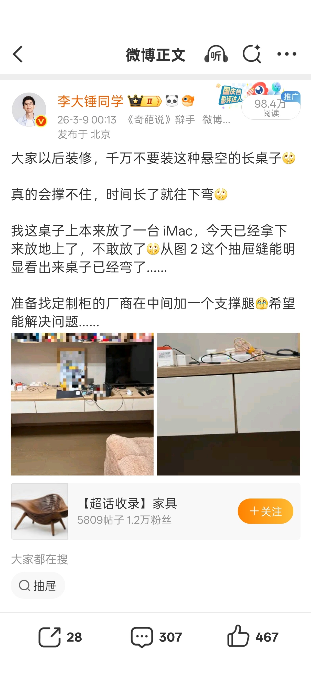 三天假期总算有时间找师傅上门解决悬浮书桌下弯的问题了