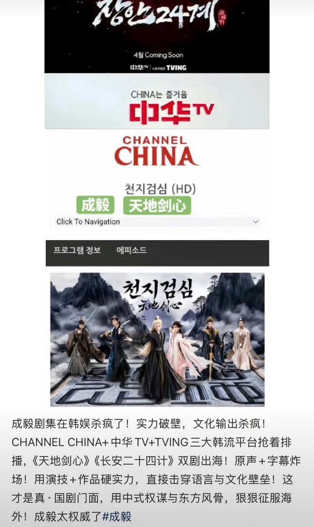 成毅作品还是太权威了!《天地剑心》《长安二十四计》于4月登陆韩国主流平台,覆盖电视频道与流媒体(中华TV、TVING、CHANNEL CHINA),成为首部在韩多平台同步排播的国产剧。韩国地铁出现《长安二十四计》宣传海报,印证角色海外影响力。成毅作品必属精品!