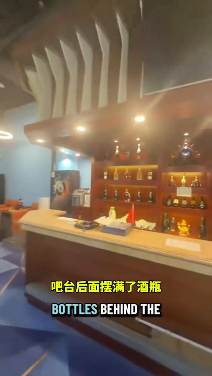 你们看,我正要进一家斯诺克俱乐部。有人吗?在中国这里根本不需要有人值守。看好了,这种事在英国根本不可能发生,这里连一个工作人员都没有。吧台后面摆满了酒瓶,连个服务人员都没有。屏幕上会显示账单金额,也就是你拿取饮品的消费金额,直接扫码付款就行。还有你使用台球桌的时长,付完就能直接离开。