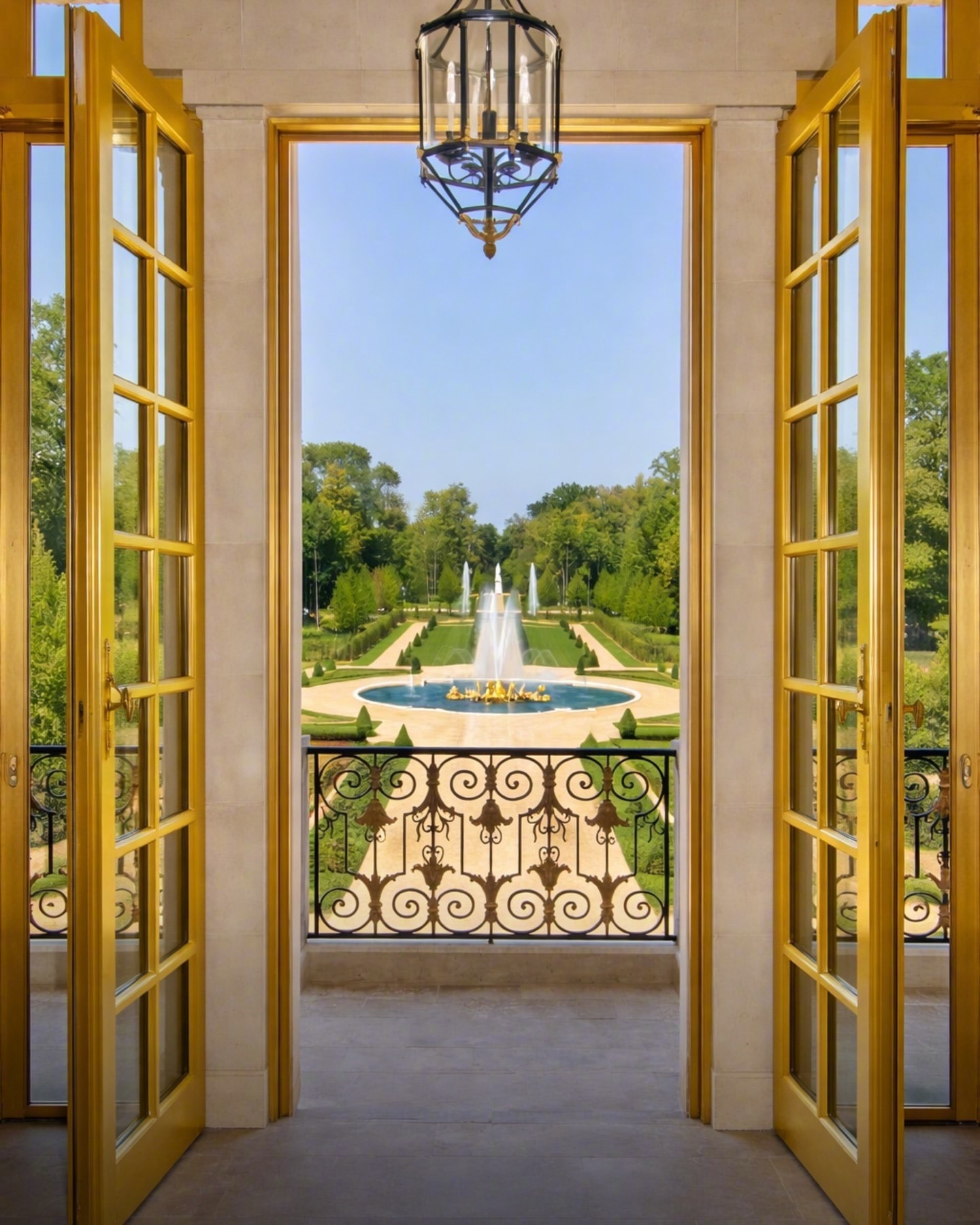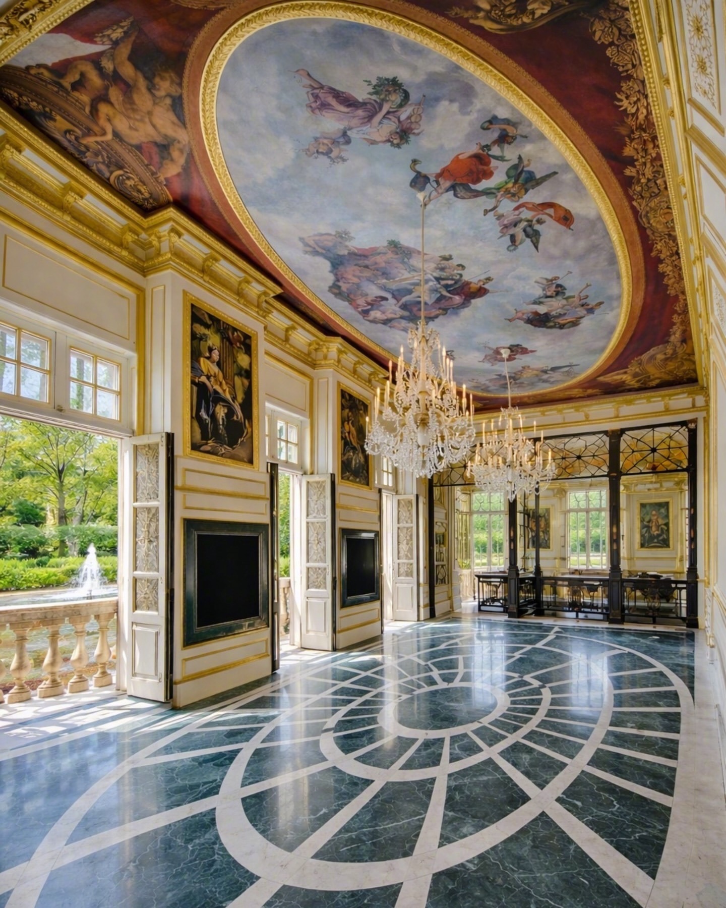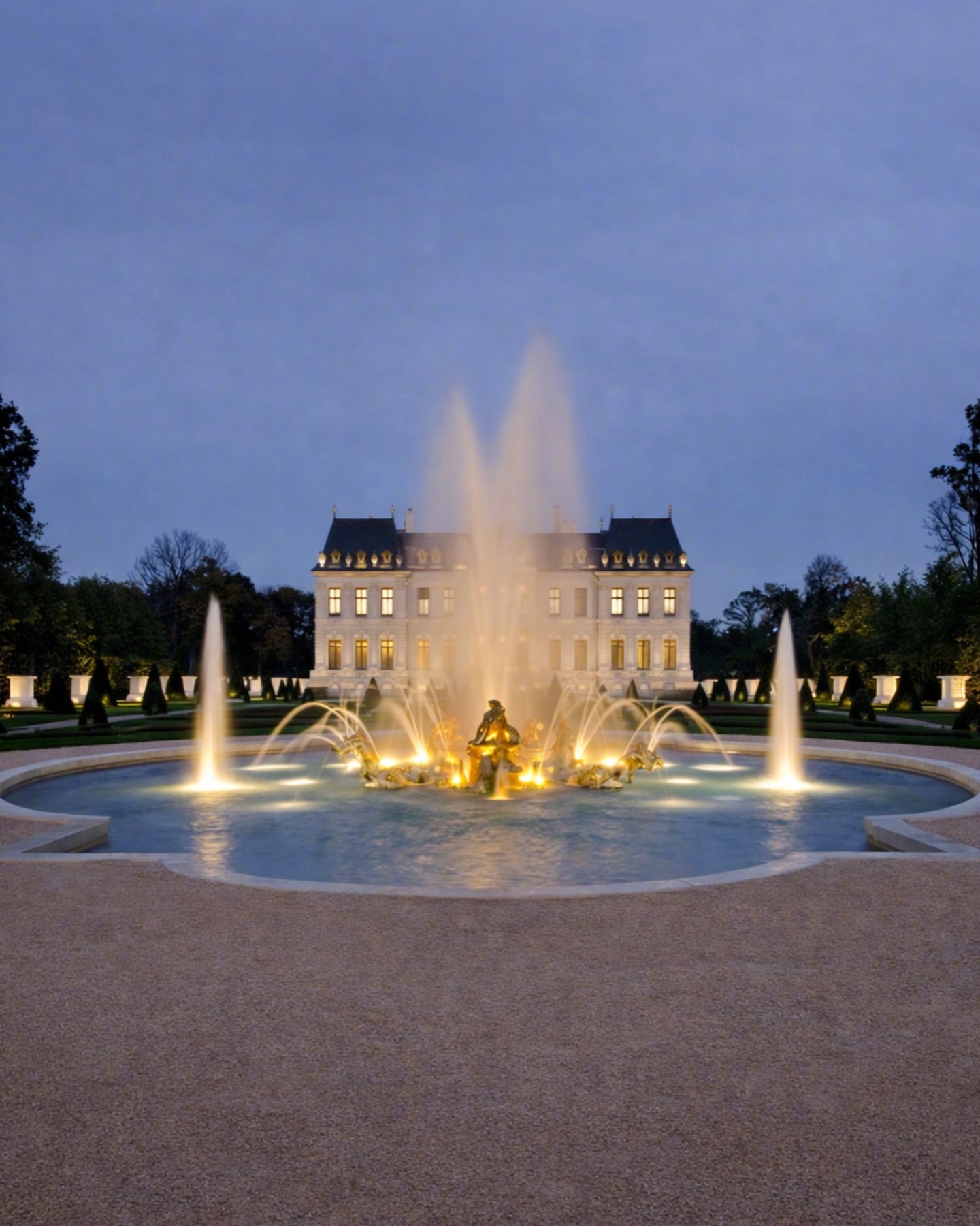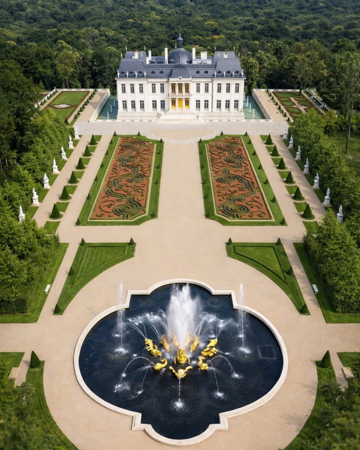 它的外观严格复刻了 17 世纪法式古典宫殿比例与装饰,花园、喷泉、轴线布局完全模仿凡尔赛式园林。内部有壁画穹顶、鎏金装饰、大理石与宫廷尺度空间。但在其历史感十足的外立面下,配备的是21 世纪的结构与科技:现代混凝土与钢结构、全屋智能系统、私人影院、豪华泳池。甚至还有一条玻璃底护城河,锦鲤在建筑下方悠然游弋。该处居所,被称为是对凡尔赛时代奢华的一次现代演绎,这也是为新一代全球财富阶层而专门设计打造。