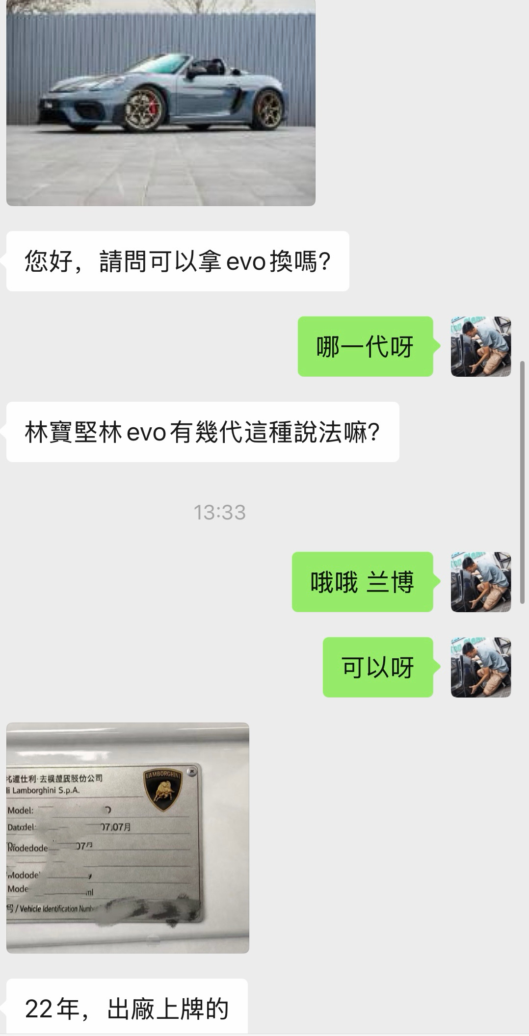 大哥本来想拿Evo换718spyderRs后来发现 我俩交易好像手续有点难搞但我坚信不久的将来 喜欢您来的车一定能卖去对岸