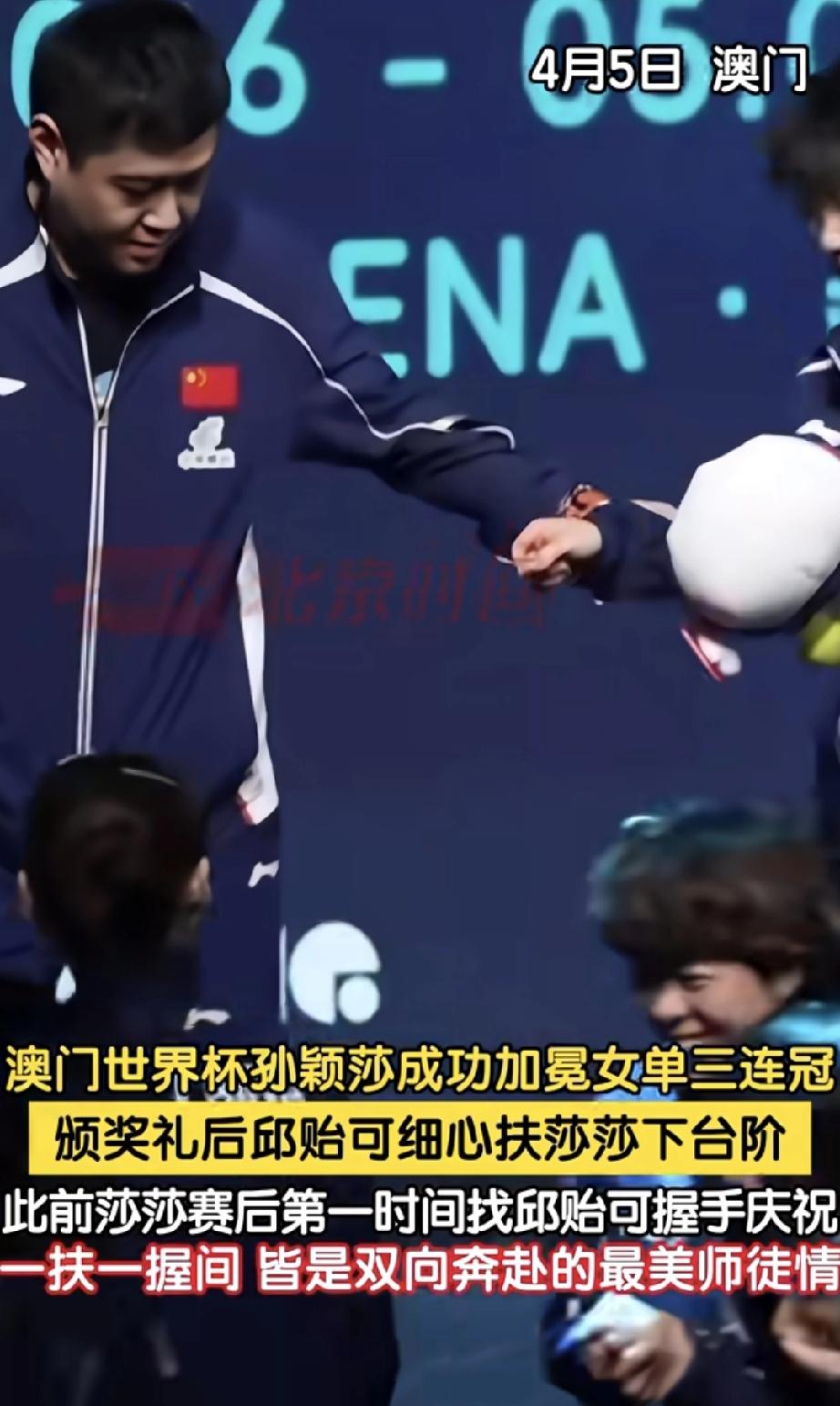 感动! 一扶一握展现最好的师徒情。 澳门世界杯,颁奖典礼后,莎莎走向邱贻可,师徒俩亲切握手。下台阶时,邱贻可扶着莎莎。这师徒感情太好了。 合影结束,大家都陆续下台阶走向后场。 台上师傅怕怕莎莎摔着,而且打完真的很累了,就细心的扶着莎莎。真好!