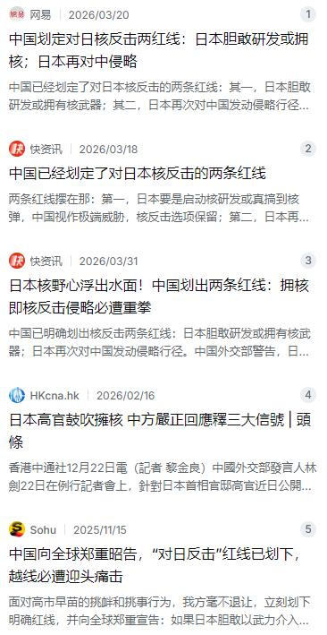 中国已经划定了对日本核反击的两条红线:其一,日本胆敢研发或拥有核武器;其二,日本再次对中国发动侵略行径! 麻烦看官老爷们右上角点击一下“关注”,方便您进行讨论和分享,感谢您的支持! 大家可能都注意到了,最近东亚这边的气氛,真的是越来越紧张了。究其根源,就是日本新任首相高市早苗上台后,一系列的操作让人不得不警惕。面对这个曾经给亚洲人民带来深重灾难的邻居,中国这次没有含糊,直接划下了两条清晰到不能再清晰的红线,而且把“核反击”这三个字摆在了最前面。这可不是闹着玩的。 第一条红线,就是日本胆敢研发或者拥有核武器。 说实话,日本的核能力一直是个公开的秘密。别看它整天嚷嚷着“无核三原则”,背地里手里握着什么牌,大家心里都有数。它打着“和平利用核能”的旗号,搞出了规模庞大的核工业体系,是目前唯一掌握核废料后处理技术、能提取武器级钚的“无核国家”。有报告显示,日本囤积的钚材料高达40多吨,虽然浓度低,但真要突破技术门槛,也就是一层窗户纸的事。 更要命的是,它的首相官邸高官在2025年底公开叫嚣“日本应该拥有核武器”,这种赤裸裸的言论简直就是在挑战国际社会的忍耐底线。对此,中国外交部发言人郭嘉昆在2025年12月19日的记者会上说得非常明白:如果相关消息属实,事态相当严重,暴露出日方一些人企图突破国际法、拥有核武器的危险图谋。这不仅是对战后国际秩序的蔑视,更是对整个东亚安全格局的致命威胁。所以中国把话说死了:你只要敢迈出这一步,无论是启动研发还是真正拥有,那就是对中国的极端威胁,中方将保留核反击的选项,而且是“毫不犹豫、最硬手段”的那种。 第二条红线,更直接,就是日本胆敢再次对中国发动侵略行径。 这条红线不仅仅是针对传统的军事入侵,还把日本最近最让人恼火的行为——军事插手台湾问题,也给包含了进去。高市早苗这个女人,上台以来在台湾问题上蹦跶得特别欢。她公然在国会抛出“台湾有事就是日本有事”的论调,甚至把“台湾有事”定性为可能构成日本行使集体自卫权的“存亡危机事态”。这是什么意思?就是给自己武力介入台海找借口,粗暴干涉中国内政。 对于中国人来说,这简直是往伤口上撒盐。二战期间日本发动的侵华战争,给中国造成了3500万以上的军民伤亡,南京大屠杀的惨状至今历历在目。现在你不仅不思悔改,还企图再次通过干涉台湾问题来阻挠中国的统一大业?这在道义和法律上都是绝对无法接受的。中国国防部的态度极其强硬,指出日本正在突破“和平宪法”的约束,图谋放弃“无核三原则”,甚至妄想武力介入台海。国防部新闻发言人蒋斌在2025年11月27日更是放出狠话:“日方胆敢越雷池半步给自己招事惹事,必将付出惨痛代价。对于任何的侵略行为,我们都将毫不留情予以迎头痛击。” 其实,这两条红线背后,是中国对日本右翼势力全面抬头的高度警惕。 高市早苗的野心绝不止于喊口号。她一上台,就急不可耐地要把日本从“专守防卫”的战车上拽下来。2025年11月,她在国会接受质询时就对“无核三原则”给出了模糊回应,暗示要动手修改。明面上她说是为了配合美国的核威慑,方便搭载核武器的美军舰艇停靠,但背地里,谁都知道她这是想一点一点撬开拥核的大门。她正在积极推动修订安保三文件,计划删除“无核三原则”中“不引进”核武器的条款。这些动作在日本国内甚至引发了前首相岸田文雄的反对。 面对日本这种赤裸裸的挑衅,中国向来不会只停留在口头警告上,一系列看得见摸得着的反制措施早就打出去了。 在钓鱼岛方向,中国的海警巡航已经实现了完全常态化。2025年全年,中国海警在钓鱼岛海域的巡航天数达到了惊人的357天,几乎一年到头都在这里执法巡航。就在2026年3月16日,日本“朝丸”号渔船硬闯钓鱼岛周边,直接被中国海警船依法管控并驱离。海警编队采用多层阵型协同封锁,执法效率和威慑力都提升到了一个新高度。这彻底打破了日本所谓的“实效控制”,让全世界看到谁才是这片海域真正的主人。 中国之所以把这两条红线划得这么硬,底气来自哪里?当然是来自强大的实力。 现在的中国早已不是百年前任人宰割的旧中国,而是拥有三位一体核打击力量的军事大国。中国在核武器的规模和发展上始终采取克制的态度,但“克制”不代表“没有”,更不代表“不敢用”。就像国防部说的那样,解放军有强大的能力、可靠的手段打败一切来犯之敌。如果日本真的头铁到要赌国运,跨过这两条红线,那么它将面对的,将是远超其承受能力的毁灭性打击。