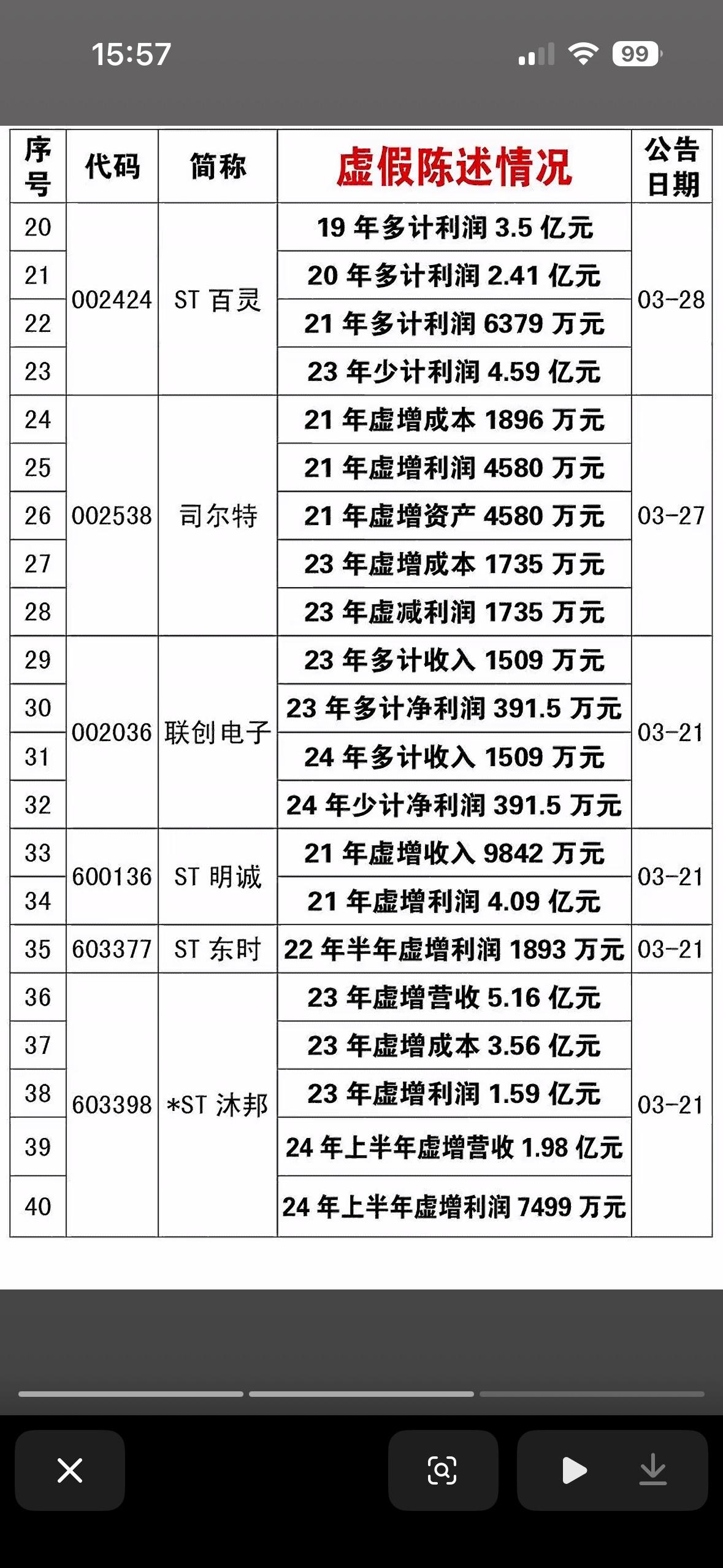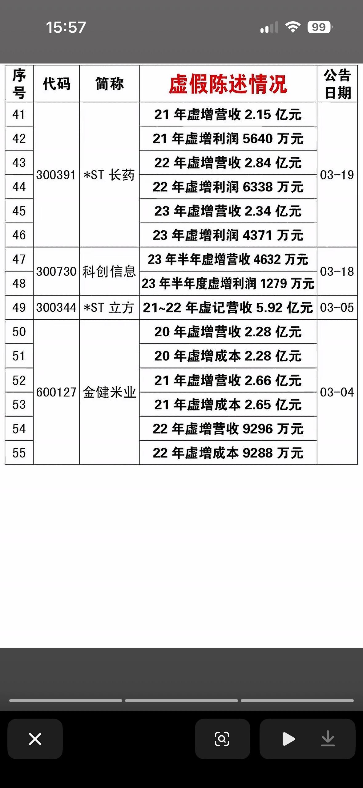 截止4月4日揭秘公司虚假陈述情况,内幕曝光! 4月4日的公司虚假陈述内幕,真是让人惊掉下巴!就拿山东XX来说,2026年4月3日晚它发公告,公司及相关当事人收到预处罚告知书。原来2024年,它在没真实发生业务的情况下,确认费用846.27万元,导致年报虚假记载,虚减利润总额,占当期披露利润总额的10.37%。监管拟对公司罚款250万,相关责任人共罚440万。早在2025年底它就因财务信息披露违规被立案。另外,之前立信会计师事务所也因金亚科技财务造假,被判决承担连带赔偿责任。公司虚假陈述危害大,投资者可得擦亮眼睛!