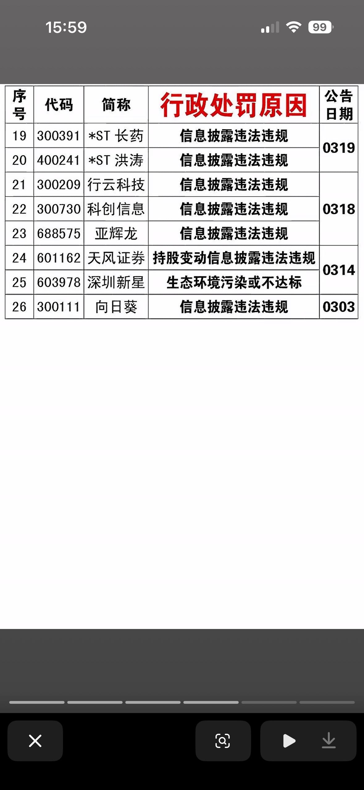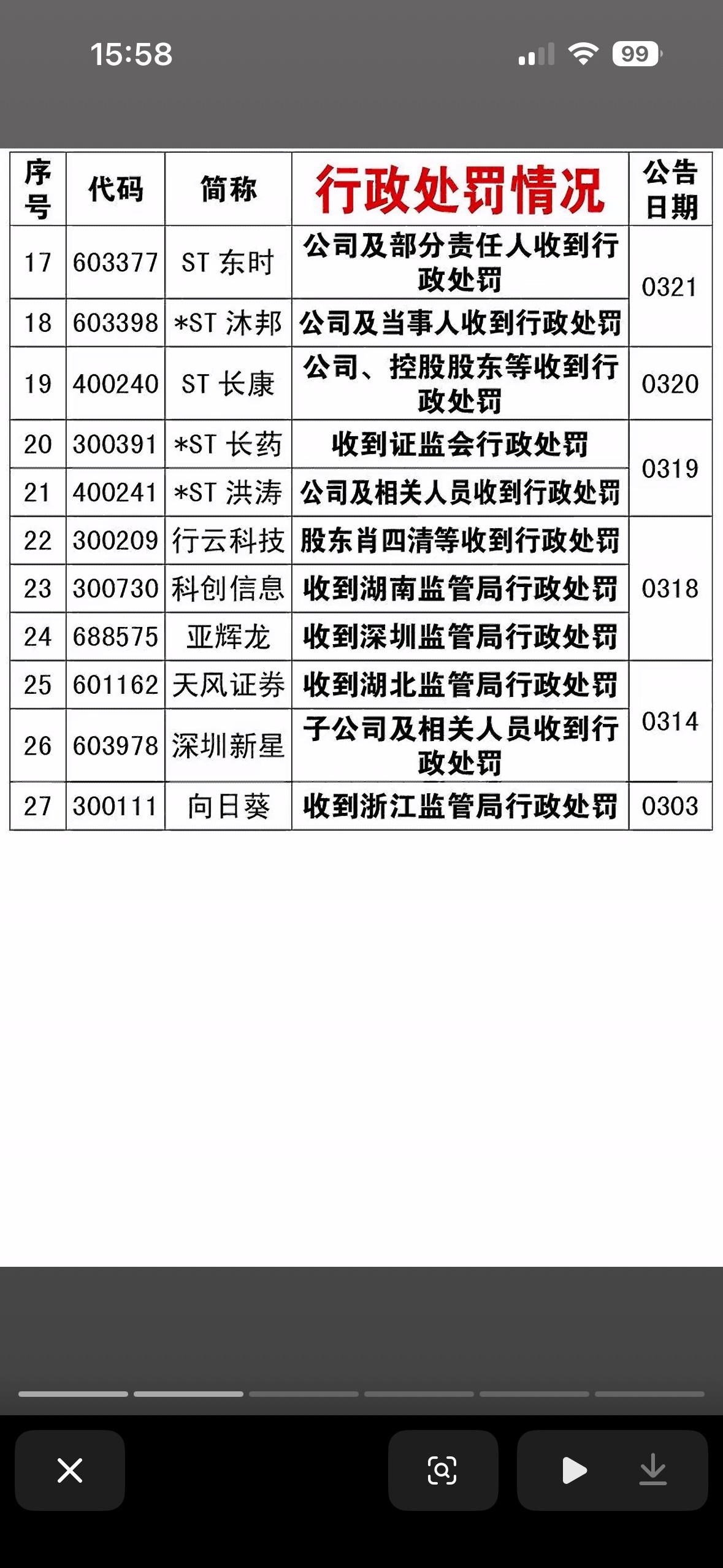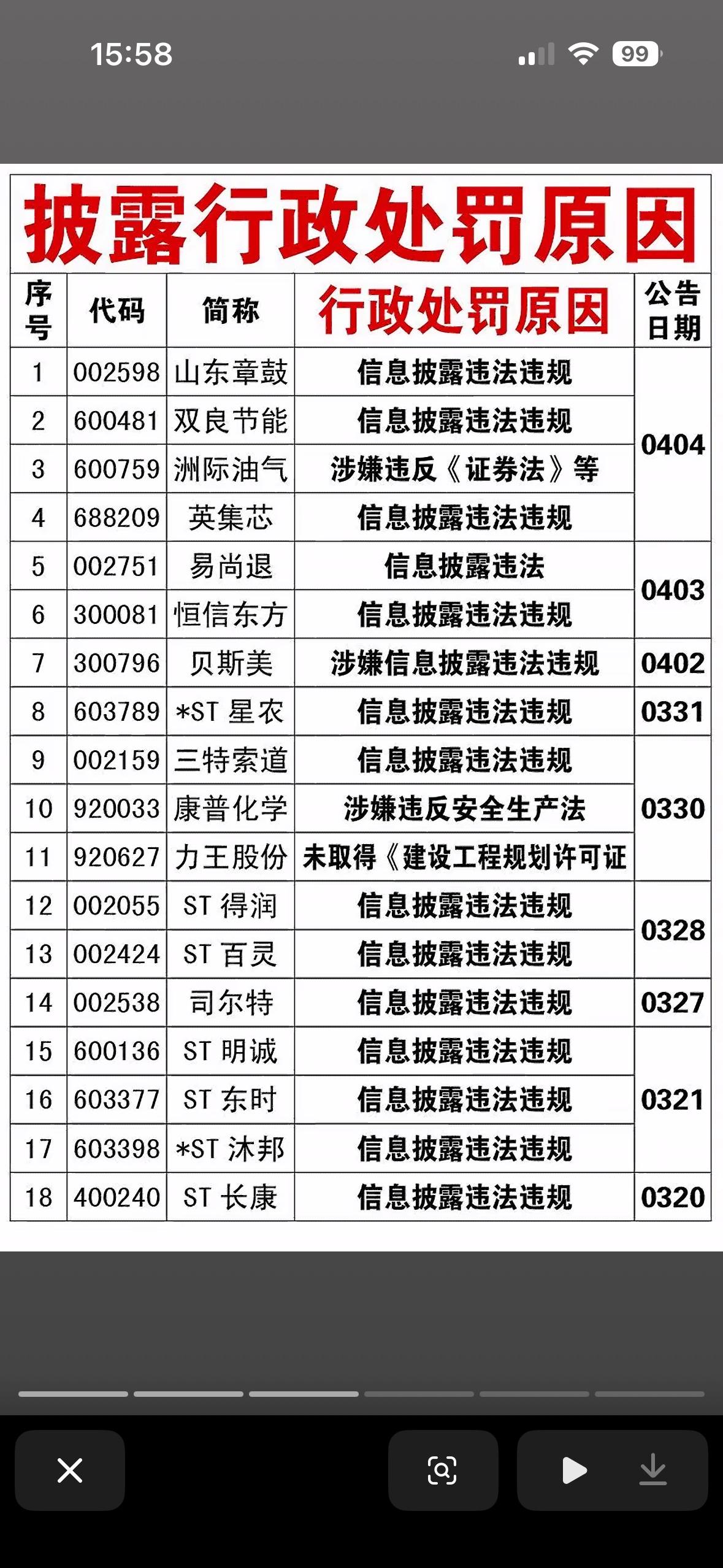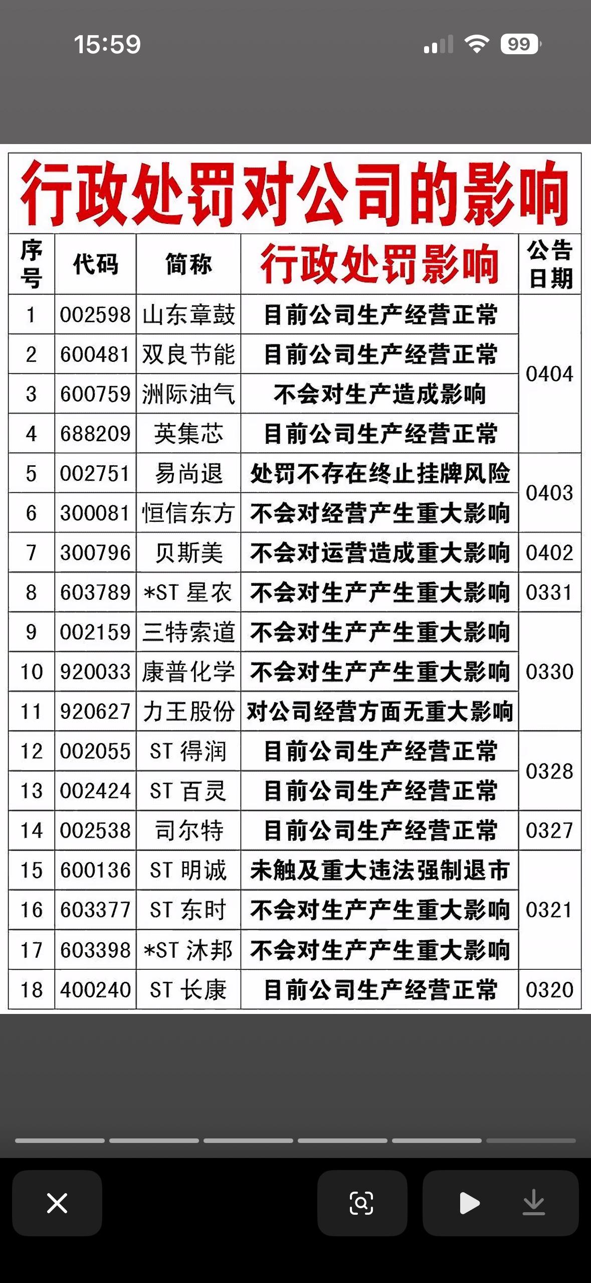 4月4日收到行政处罚的上市公司,公司经营正常与否一目了然! 4月4日收到行政处罚的上市公司,其经营状况确实能从中看出端倪。清明假期刚过,4月初监管重拳出击,3天就有13家上市公司密集被查被罚。4月3日晚更是“一夜十家”,节奏快、力度大前所未见。 这13家公司覆盖10余个行业,绑定超50万户股东,每户平均浮亏一度超8万。从违规类型看,信披违规占比超70%,还有财务造假等多种违规。像山东章鼓因虚增费用做低利润846万元被处罚。收到行政处罚,公司经营正常与否一目了然,投资者可得擦亮眼睛。