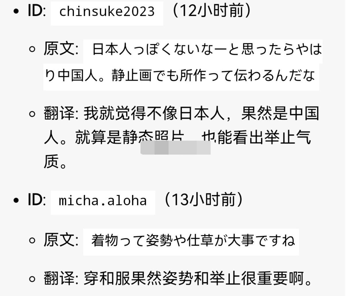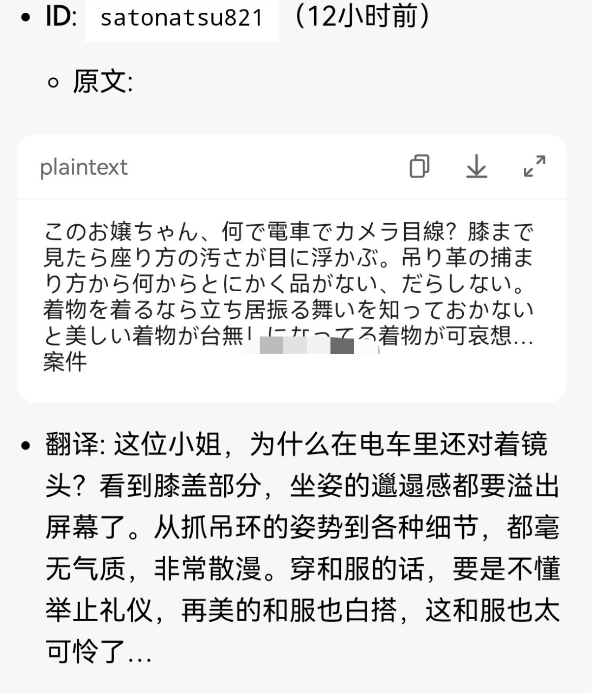 有一位中国女子到日本去旅游,穿着日本和服在地铁里拍照,日本人从她的行为举止和气质上判断出她是中国人,认为她穿和服在地铁里自拍的行为,“坐姿非常散漫、无气质、不会举止礼仪、碍眼、低俗到极点”。