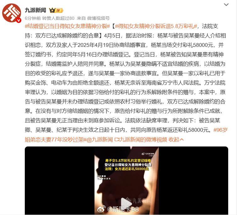 得知女友精神分裂诉退5.8万彩礼这案件能全额返还(虽然总价不高),是因为没有在一起共同生活,所以才判全额退还,两人如果共同生活了,哪怕很短时间,这5.8万都无法全部索回前几天有个热门,河南周口太康县男子经人介绍与一女子相亲后,支付彩礼三金和车款23.8万元,生活不到3个月男子发现“未婚妻”隐瞒尿毒症、糖尿病性低血糖、高血压等病史。法院以共同生活过一段时间为由,认定两人存在短暂的事实婚姻关系,为体现所谓人文关怀,只让女方返还16.6万