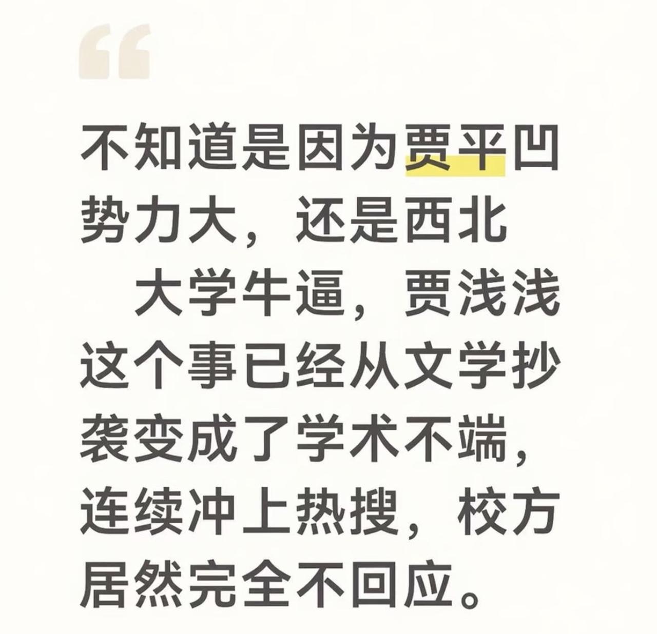 西北大学这波“装死”操作,算是把底裤都掉光了。贾浅浅那点事闹得全网皆知,人家学校硬是能稳如泰山。这哪是没看见,这分明是被架在那儿下不来台,不敢张嘴。 2022年她入选中国作协拟发展名单那回,相关话题全网阅读量直接冲到50多亿,今年被扒出论文涉嫌抄袭,单日话题阅读量就破了2.8亿,这么大的舆论声量,学校从头到尾连一句像样的官方回应都没出过。 换别的高校根本不敢这么拖,2022年中南大学遇上教师学术不端的舆情,全网发酵还不到48小时,校方就直接发了通报启动核查,该走的流程一步没落下,根本没想着装聋作哑躲过去。 说白了真不是他们看不见,是根本不敢接这个话。一开口就要直面当初的人才引进、职称评审、论文审核这些核心问题,牵一发而动全身,只能硬着头皮装死,可越躲越让人生疑。