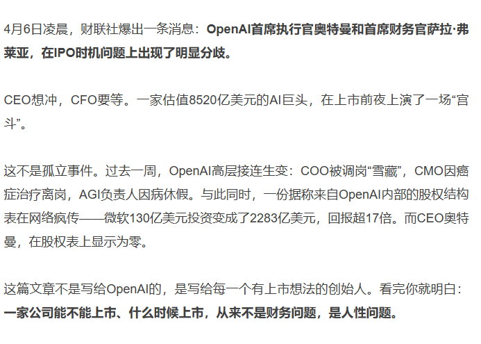 今天AI圈一个很重要的信号:OpenAI 内部开始出现明显分歧CEO想推进IPO,但CFO直接否认“今年不可能”,同时还伴随着高管层动荡这不是普通公司内斗,而是一个阶段变化: