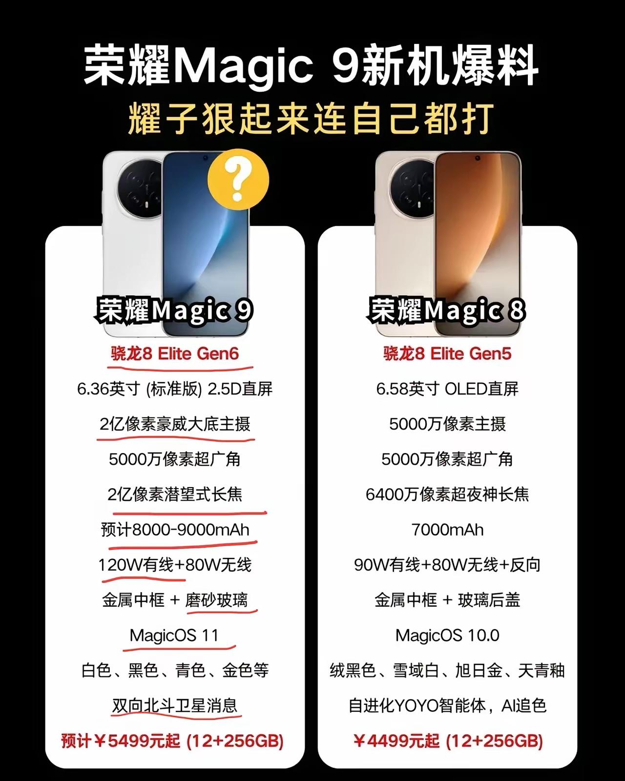 荣耀这次是真的狠,Magic9直接与自家Magic8刚上了,堪称年度最香旗舰。骁龙8 Elite Gen6芯片、双2亿像素影像、8000mAh超大电池,120W快充补齐短板,双向北斗卫星消息拉满安全感,MagicOS 11让AI体验再上台阶。5499元起的定价,加量不加价,直接把直屏旗舰的天花板焊死了。直屏党、续航党、拍照党,这次全都赢麻了。