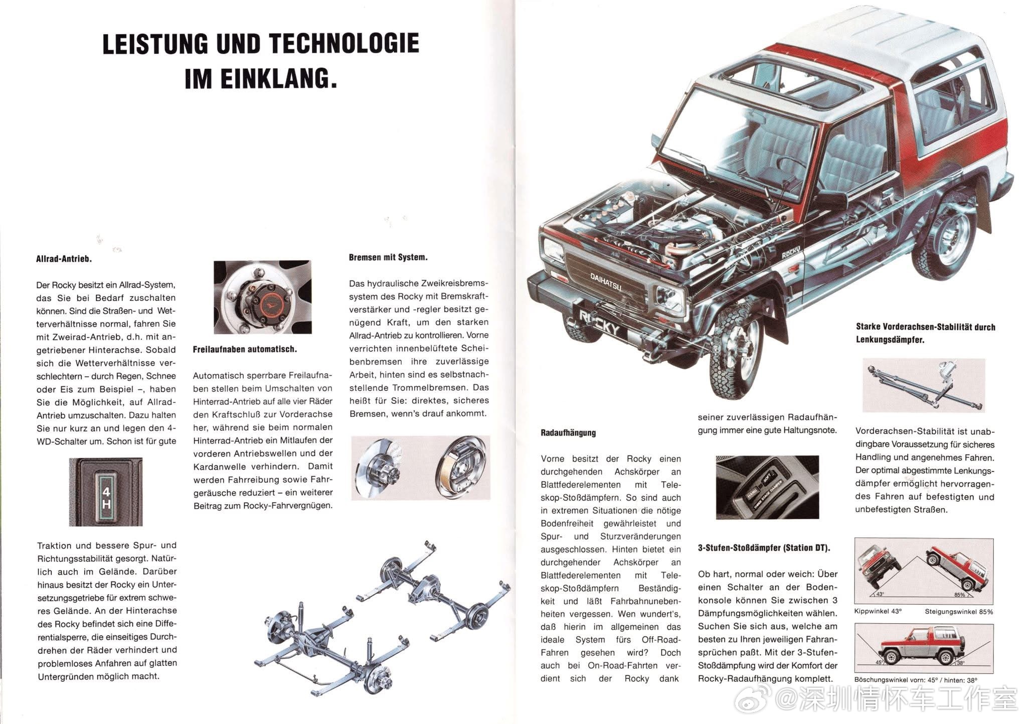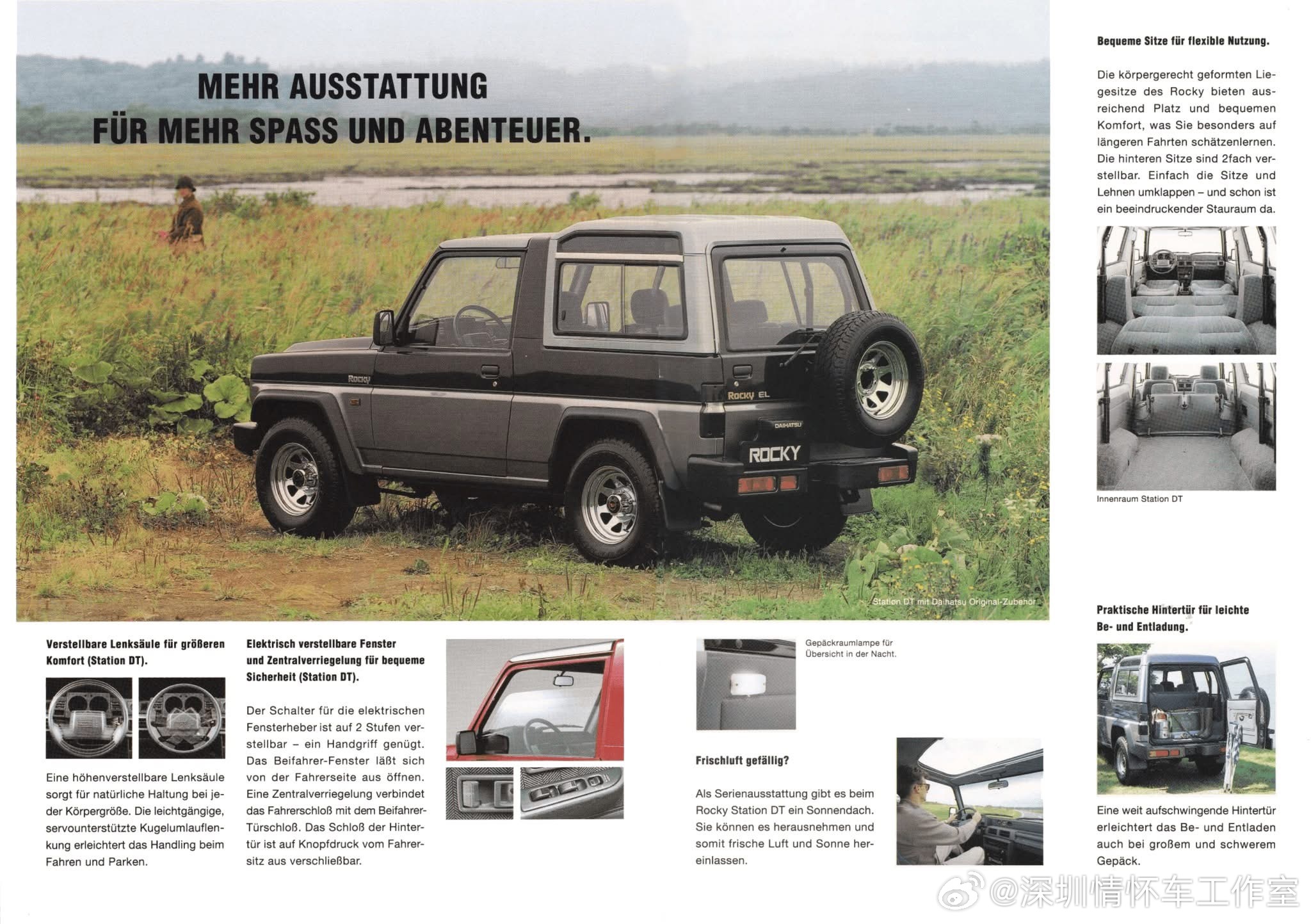 1991 大发 Rocky(F300/Feroza),80 年代末–90 年代初全球最早一批小型三门越野 SUV, 比丰田 RAV4(1994)、本田 CR-V(1995)早 4–6 年,定义“小而硬”路线。梯形大梁+前后硬轴/钢板弹簧(后期改前独立),同级别极强越野与抗造能力,机械简单、维修便宜、高可靠性,成为东南亚、澳洲、南美工地/林业/探险热门车。大发方盒子、可拆卸车顶、纯机械四驱、1.6 高转自吸,90 年代 JDM 经典符号。至今在越野玩家、老车收藏圈热度高,保值、改装潜力强。总的来说1991 大发 Rocky 是早期日系迷你硬派 SUV 的标杆,以小尺寸、强越野、高可靠打开全球市场,比主流城市 SUV 更早定义“小型多功能越野”,至今仍是情怀与实用兼具的经典。该车型直到1997 后被 Terios(特锐) 取代。