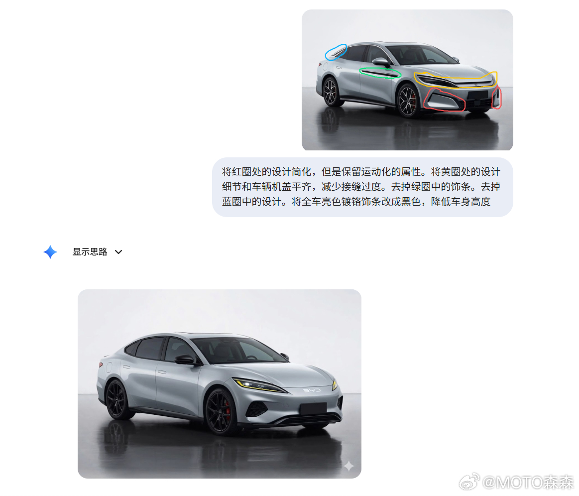 刚才我尝试用我的审美去调整其他品牌的车,然后发现——设计简化后的汉L原来就是海豹08 差异在于是一体大灯还是分体大灯 如果手动去强化设计细节,ai自动生成的任务标题就是“byd seal”,然后就会一不小心就生成海豹ev的胡须灯
