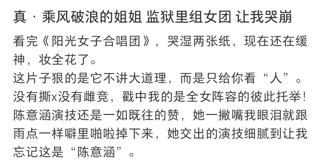 阿信喊话让陈意涵负责,其实是对《阳光女子合唱团》最温柔的夸赞✨阿信喊话让陈意涵负责电影阳光女子合唱团那些在影院里忍不住落下的眼泪,是对角色、对故事最真诚的回应。愿每个被生活磋磨的人,都能在歌声里找到治愈的力量。