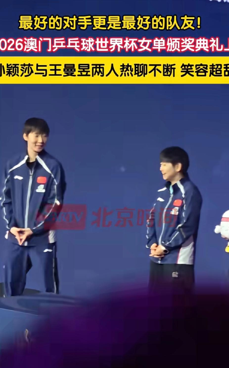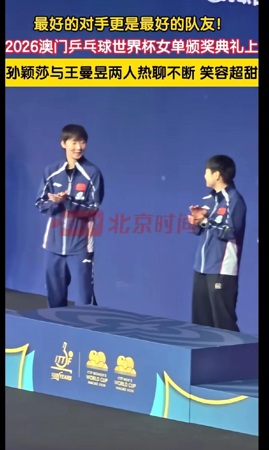 救命!澳门世界杯颁奖台,海产姐妹太甜了 2026澳门世界杯女单颁奖台前,海产姐妹这一幕真的绝了! 镜头扫到领奖台时,孙颖莎和王曼昱正并肩站着。还没正式颁奖,两个人就凑在一起叽叽喳喳聊个不停,脸上笑开了花,眉眼弯成了小月牙,连嘴角的梨涡都藏不住。 赛场上她们是针锋相对的对手,每一分都拼尽全力;可下了场,她们是彼此最懂的“海产姐妹”,是无话不谈的闺蜜,也是并肩征战的队友。 这种并肩站在领奖台,还能毫无顾忌分享小开心的状态,真的太戳人了!最好的对手,也是最好的彼此,这就是国乒姐妹花的神仙情谊呀! 海产姐妹 孙颖莎 王曼昱 澳门乒乓球世界杯