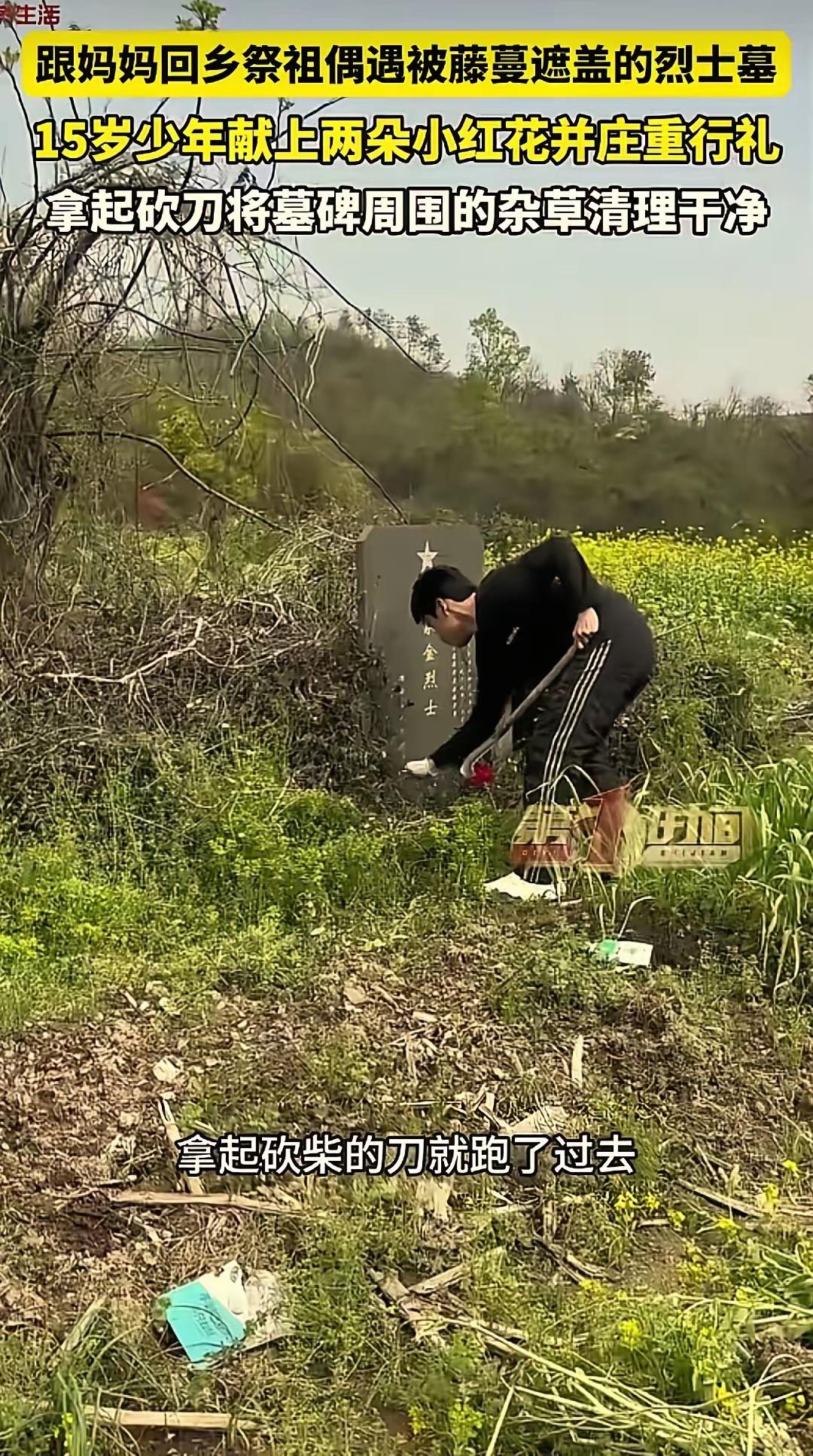 “太懂事了!”江西九江,一女子带15岁儿子回乡上山祭祖,意外在途中发现一座长满藤蔓的烈士墓,两人祭拜祖宗后,儿子突然提出让母亲先等他一会,拿着工具跑向烈士墓,接着一个举动让人敬佩不已。 少年强则国强,这句话的含金量还在上升。 根据第一时间4月5日报道,这件让人感动又破防的事,就发生在一位少年身上。 女子叫陈丽,家在九江柴桑区的乡村,儿子林宇今年刚上高一,清明假期,她特意带着儿子回乡祭祖,就是想让孩子感受传统习俗,记住祖辈的根。清明前九江刚下过几场春雨,山间小路泥泞湿滑,路边野草长得半人高,母子俩踩着泥路往山上走,没走多远,林宇突然停下了脚步。 他的目光落在路边一处不起眼的土坟上,坟头被密密麻麻的藤蔓和野草完全覆盖,连墓碑都被缠得严严实实,只露出一点边角,看着已经很久没人打理过。林宇拉着妈妈凑过去,小心翼翼扒开缠在碑上的藤蔓,指尖蹭上厚厚的青苔,终于看清了碑上刻着的两个字——烈士。 那一刻,林宇的表情一下子严肃了起来。他没再多说什么,跟着妈妈继续往祖辈的墓地走,可一路上,他的目光总忍不住往回瞟,嘴里还小声念叨着,怎么没人给烈士爷爷扫墓啊。陈丽跟他说,这座墓在山里很多年了,烈士的家人大概率早就不在本地,时间久了,就慢慢被人忘了。 祭拜完祖辈,陈丽正收拾东西准备下山,林宇突然一把拿过她手里的镰刀,还有装着矿泉水和抹布的袋子,跟她说,妈你在这等我一会,我马上回来。没等陈丽反应过来,他已经转身朝着刚才那座烈士墓的方向跑了过去,泥路湿滑,他跑的时候踉跄了两下,也没放慢脚步。 到了墓前,林宇先拿着镰刀,一点点割掉缠在墓碑和坟头上的藤蔓,动作放得极轻,生怕镰刀划到墓碑,惊扰了烈士的安息之地。藤蔓上带着倒刺,没一会,他的手背就被划了好几道细细的口子,他也没当回事,随手蹭掉手上的泥,继续清理。割完藤蔓,他又蹲在地上,用手指一点点抠掉碑面上的青苔,指甲缝里塞满了黑泥,连指尖磨红了都没停下。 清理完碑面,他拧开矿泉水,把水一点点倒在抹布上,蹲在墓碑前,仔仔细细擦拭着每一个刻字。随着抹布一遍遍擦过,碑上的字迹慢慢清晰起来,这是一位1949年牺牲的本地游击队员,牺牲的时候才21岁,为了掩护村里的群众转移,挡住了敌人的追兵,最终壮烈牺牲。 擦完墓碑,林宇又把坟头和墓周围的野草、碎石全都清理干净,还特意用镰刀把墓边的排水沟疏通开,怕后续下雨积水泡到坟茔。前前后后忙活了快一个小时,他的校服外套被树枝刮破了口子,额头上的汗顺着脸颊往下淌,后背的衣服也被汗水浸透了,可看着收拾得干干净净的烈士墓,他脸上露出了踏实的笑容。 他从兜里掏出本来准备给祖辈的祭品,几个苹果,还有一小杯白酒,恭恭敬敬地摆在墓碑前,站直身子,认认真真对着烈士墓鞠了三个躬。他对着墓碑小声说,烈士爷爷,我来看你了,谢谢你用命换了我们现在的好日子,以后每年清明我回来,都来给你扫墓,不会让你再孤零零的。 陈丽把这一幕拍了下来,发到了网上,很快就引来无数网友的点赞和留言。2026年清明期间,全国有超千万青少年走进烈士陵园、烈士墓区,自发开展祭扫活动,用自己的方式缅怀先烈。我们总说红色传承,从来都不是课本里冰冷的文字,也不是挂在嘴边的口号,是这个15岁少年弯下腰的每一个动作,是他刻在心里的敬畏与感恩。少年懂得铭记英雄,民族就永远有脊梁,国家就永远有希望。 各位读者你们怎么看?欢迎在评论区讨论。