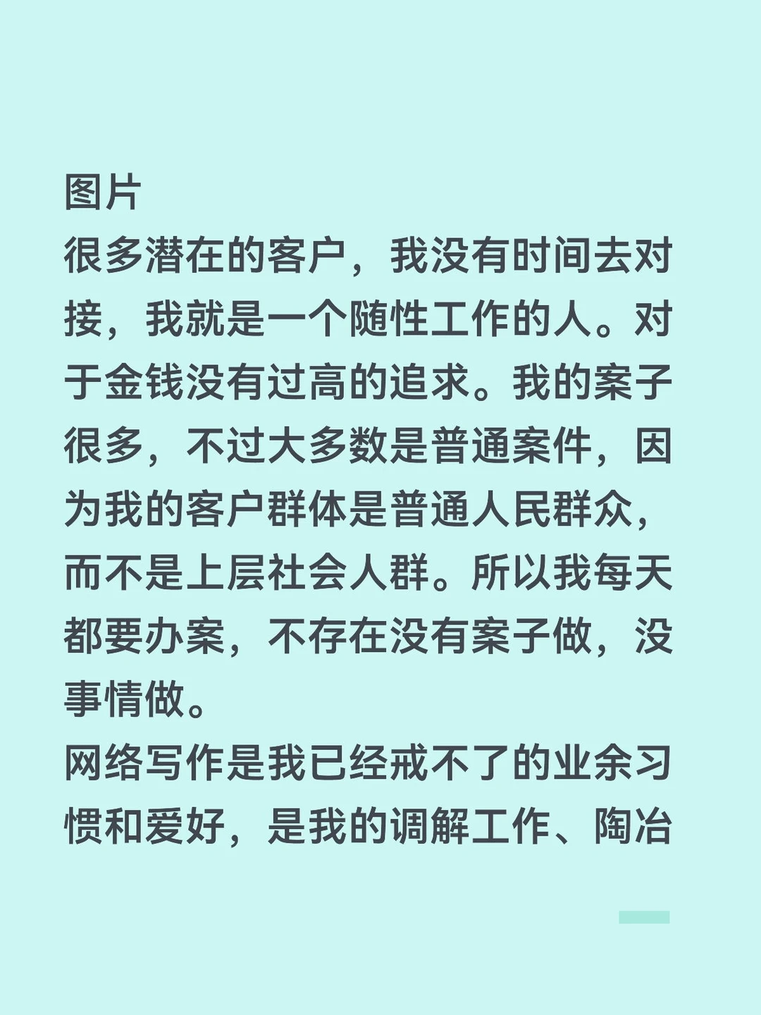 很多潜在的客户,我没有时间去对接,我就是一个随性工作的人。对于金钱没有过高的追求。我的案子很多,不过大多数是普通案件,因为我的客户群体是普通人民群众,而不是上层社会人群。所以我每天都要办案,不存在没有案子做,没事情做。