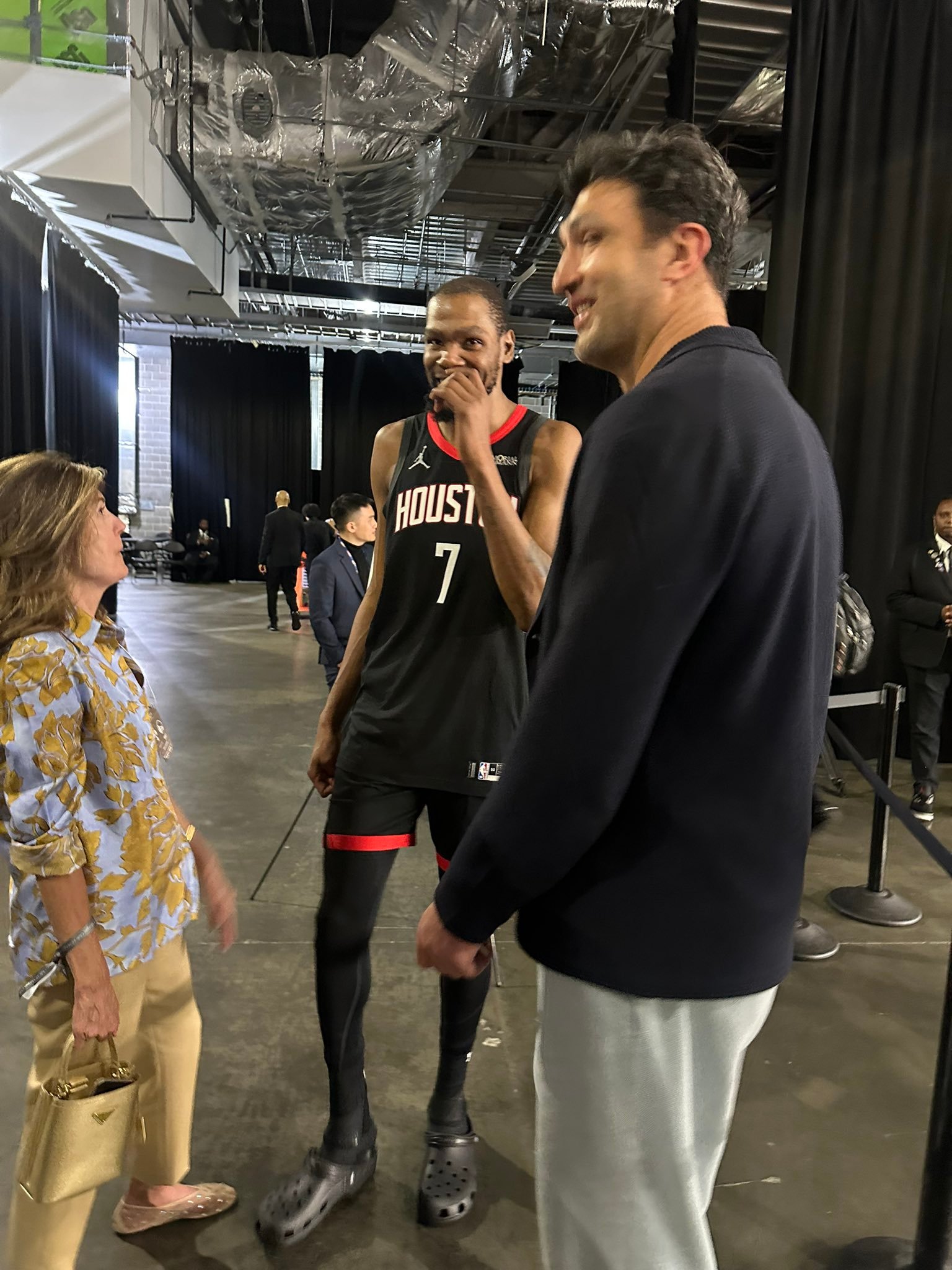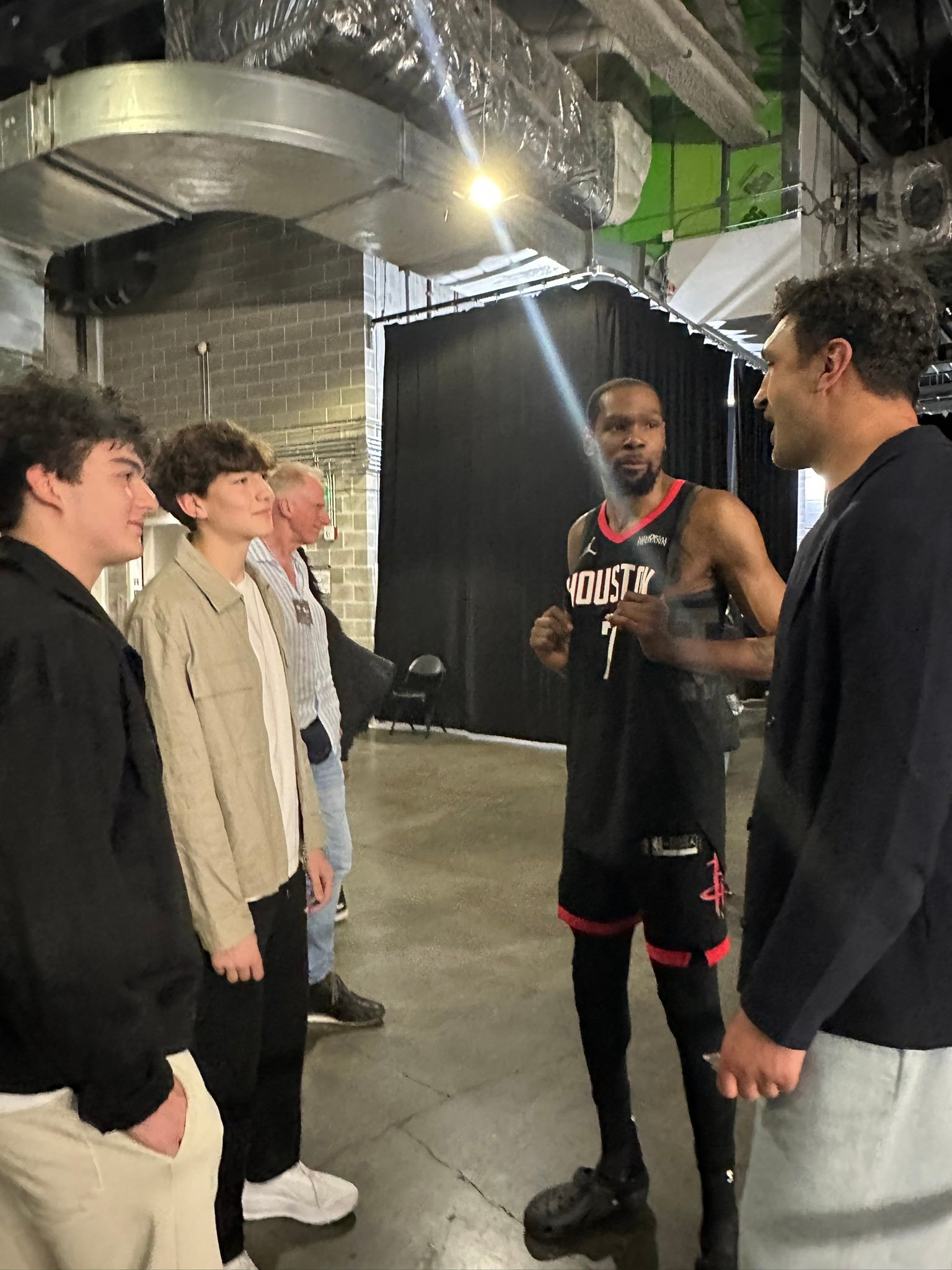 今日赛后,KD与玛格特·科尔、扎扎以及他的儿子们叙旧。NBA