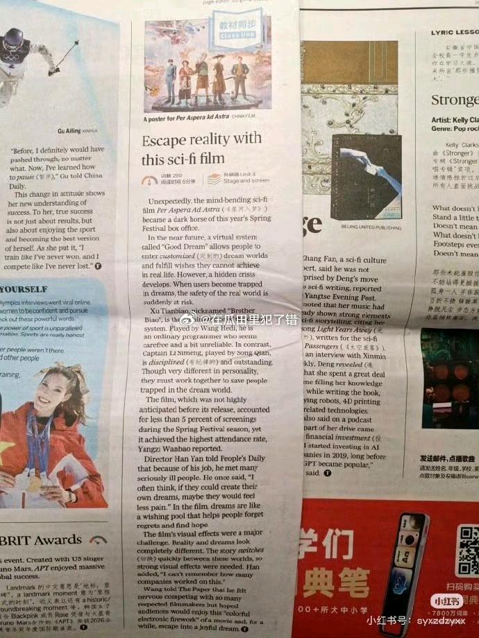 二十一世纪学生英语报上出现电影《星河入梦》 从小培养审美能力,科技启蒙,这电影是中国科幻最高水准电影。 流媒体四大平台可以预约。