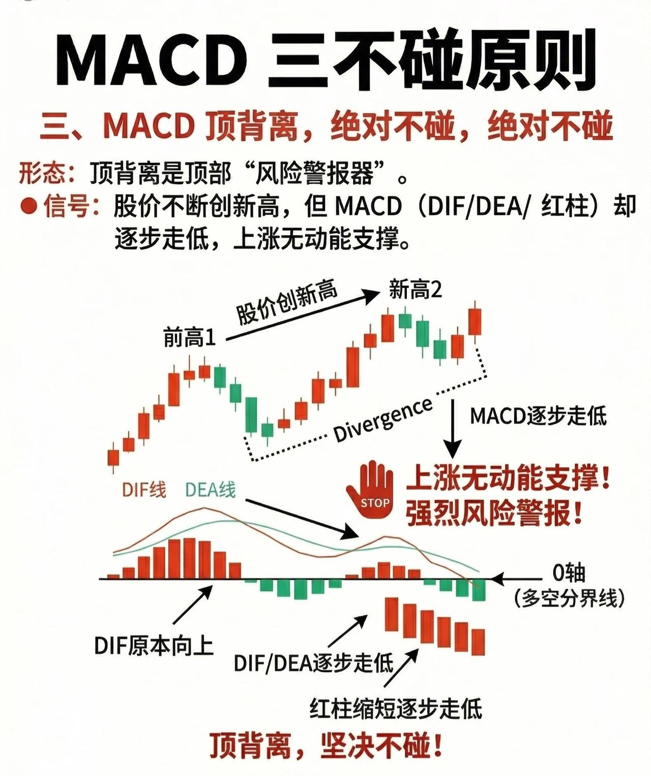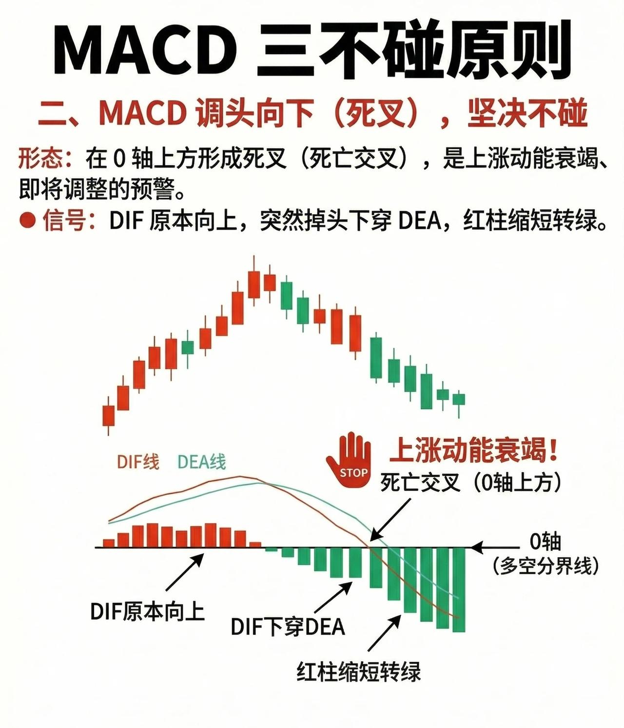 MACD“三不碰”原则(精炼版) 一、MACD下穿0轴:坚决不碰 - 形态逻辑:0轴是多空力量的“分水岭”。当DIF(快线)、DEA(慢线)从0轴上方跌破至下方,且MACD红柱翻绿时,意味着多头力量彻底耗尽,空头完全主导盘面,是强烈趋势反转信号。 - 图表验证:K线由涨转跌,DIF/DEA下穿0轴,红柱切换为绿柱,空头动能开始释放。 二、MACD死叉(0轴上方):坚决不碰 - 形态逻辑:在0轴上方区域,DIF(原本向上运行)突然掉头向下穿破DEA,同时红柱快速缩短并转绿——这是上涨动能衰竭、行情即将调整的预警信号(俗称“死亡交叉”)。 - 图表验证:K线冲高后回落,DIF由升转跌下穿DEA,红柱缩量转绿,多头推升动力消失。 三、MACD顶背离:绝对不碰 - 形态逻辑:顶背离是顶部“风险警报器”——股价持续创新高,但MACD指标(DIF/DEA曲线、红柱高度)却逐步走低,说明上涨缺乏动能支撑,后续回调风险极大。 - 图表验证:股价突破前高(新高2>前高1),但DIF/DEA未同步新高、红柱持续缩短,形成“价涨量(能)跌”的背离结构。 核心总结 这三个信号本质是“多头衰败/空头崛起”的不同阶段: - 下穿0轴=趋势反转(空头彻底掌权); - 0轴上方死叉=上涨动能枯竭(调整在即); - 顶背离=虚假突破(无动能支撑的高点)。 遇到任一信号,都应规避交易,等待趋势明朗后再做决策。 (注:润色后保留核心逻辑,优化了表述的流畅性、专业术语的统一性,并通过“形态逻辑+图表验证”的结构让信号更易懂。)