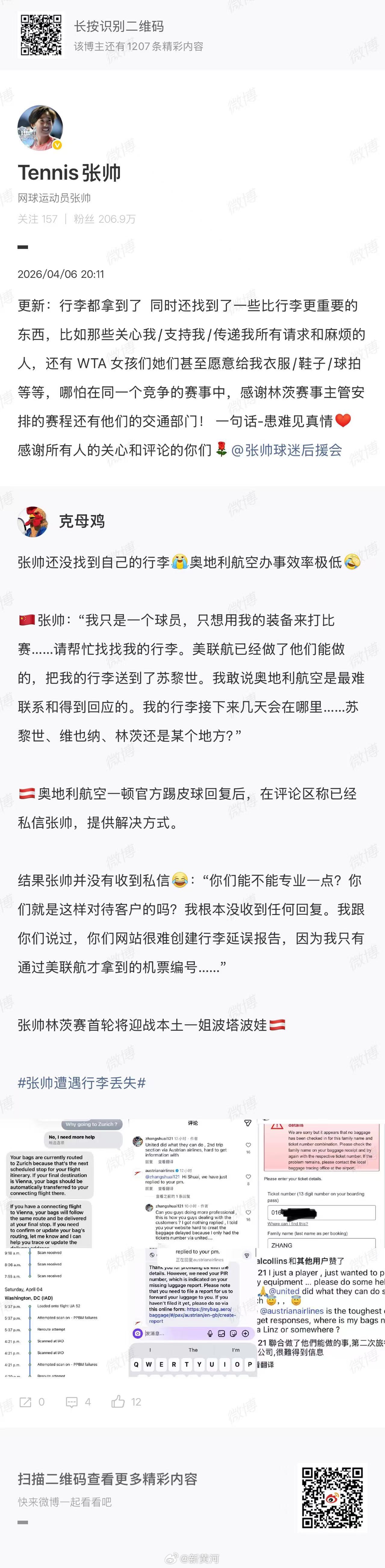 【#张帅的行李拿到了#】#张帅回应行李滞留华盛顿机场# 4月4日,网球运动员从美国转战奥地利林茨参赛,但托运行李(含全部运动装备)滞留在华盛顿机场。问题源于美联航与奥地利航空的跨国联运衔接失误。