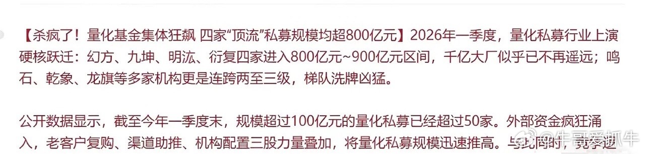 量化围猎下的散户困局:为何我们非要在中小盘里“送人头”?量化私募狂飙,幻方、九坤等四家顶流规模直冲800-900亿,百亿量化俱乐部已超50家。面对这支量化大军,A股散户却依然执迷于中小盘,非要去题材垃圾股里给量化“送菜”,转头又抱怨量化割得狠,这到底是为什么?其实很简单:散户的交易天性,撞上了量化的降维打击。很多散户不明白,量化在中小盘股里的掌控力有多恐怖。数据显示,小盘股成交里超50%是量化资金,它们手握微秒级极速通道,精准捕捉散户追涨杀跌的本能,制造假盘口、玩伪T+0,把散户的每一次冲动都变成精准收割。你以为是在博弈机会,实则是被算法提前锁定的猎物。可为啥散户就是不买大盘蓝筹?不是不想,是“暴富执念”打败了“风险意识”。蓝筹股波动小、涨得慢,不符合散户“一天一个板”的幻想;而中小盘题材股自带高弹性,哪怕是垃圾股,只要有个热点就能起飞,这种“一夜暴富”的诱惑,谁能扛得住?一个想赚快钱,一个有能力收割,这不就是赤裸裸的“愿打愿挨”吗?但市场的进化规律从来不会缺席。参考成熟市场的路径,当散户被中小盘的反复收割“割怕了”,不敢再碰纯题材垃圾股,被迫转向沪深300、中证A500等宽基ETF,以及银行、核心消费等权重蓝筹时,市场的慢牛根基才算真正筑牢。到那时,量化的野蛮收割会收敛,散户的博弈成本会降低,指数慢牛才会从预期变成现实。这不是鸡汤,是市场资金从“散兵游勇”到“机构化”的必经之路。